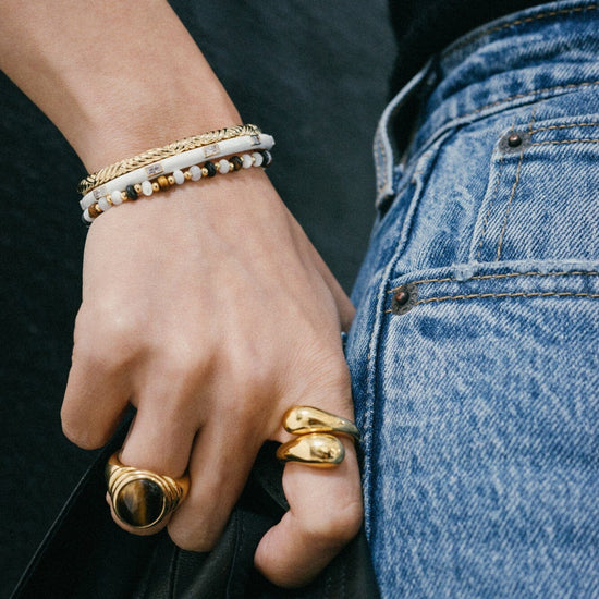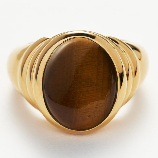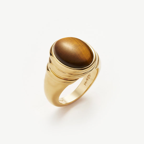 Pared-back modern meets vintage. This dome statement ring is embellished with a raised tiger's eye cabochon gemstone, surrounded by triple ridge detailing on a smooth chunky band.