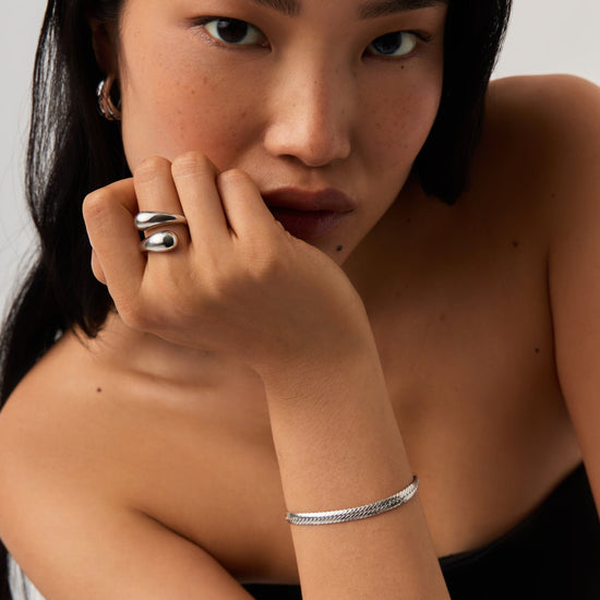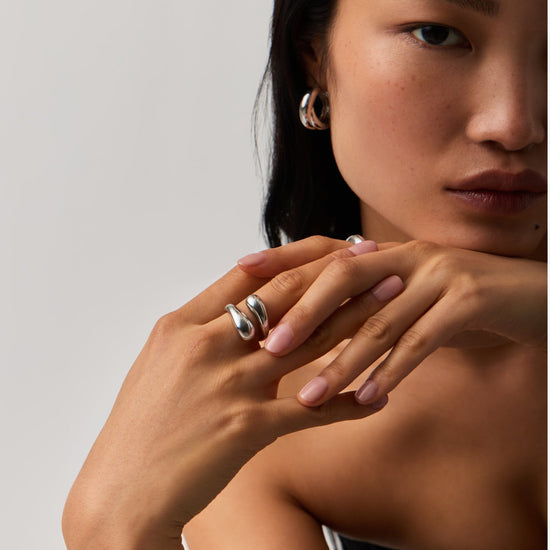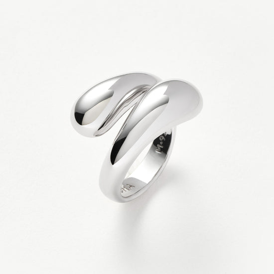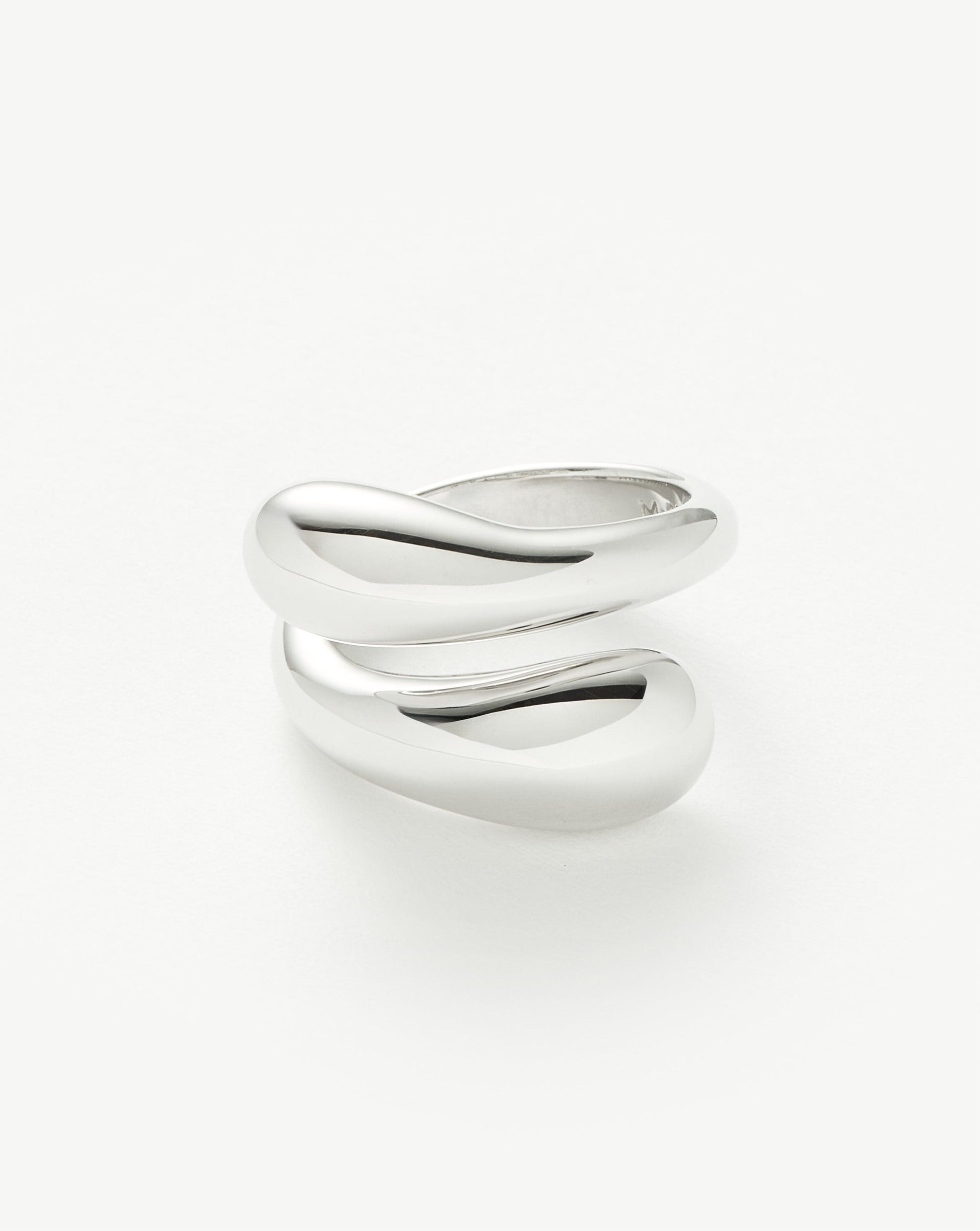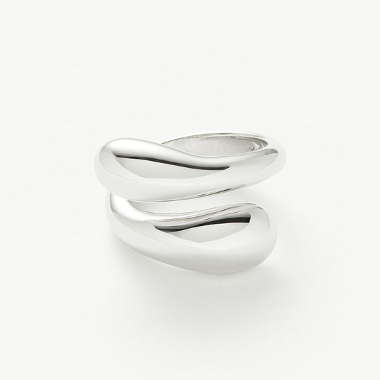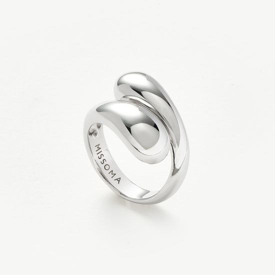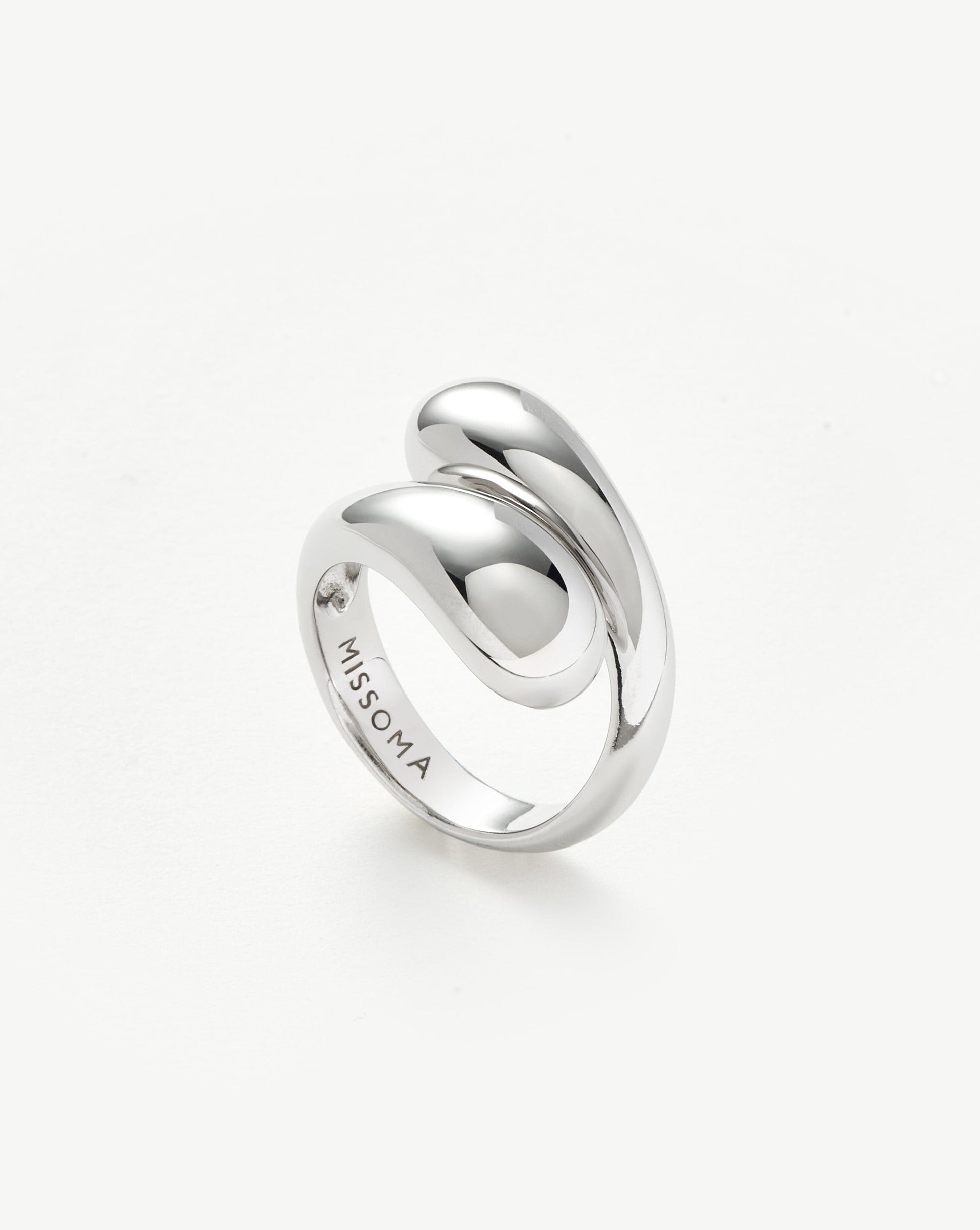 This statement sculptural bypass ring twists into a wider droplet design. Wear solo or pair with more delicate rings for contrast.