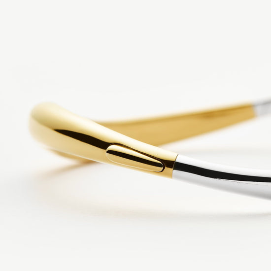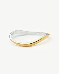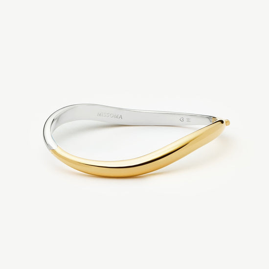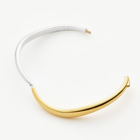 This everyday mixed metal bangle features our signature Savi 'S' shape as the perfect starting point for your arm stack. Designed with a hinged oval shape for easy wear, the bangle can be worn with either the gold or silver front facing, giving you two bangles in one.