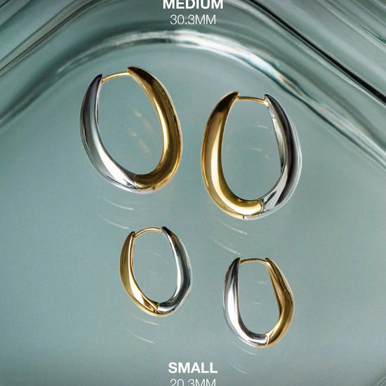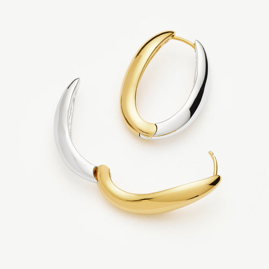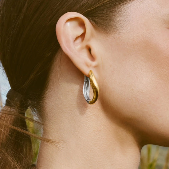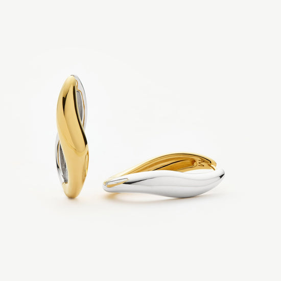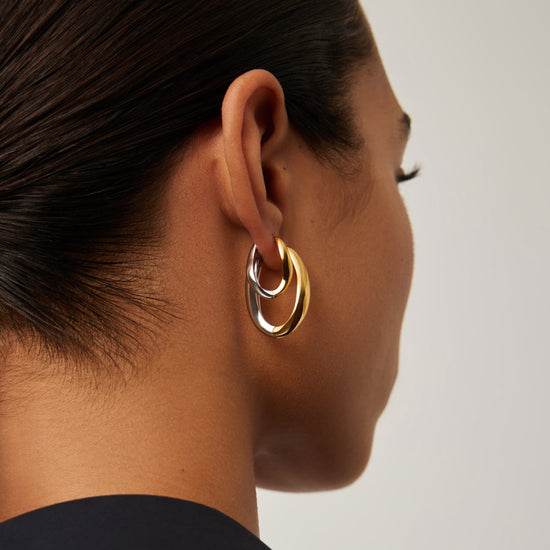 These signature Savi 'S' shaped large hoops in mixed metals can be worn with either silver or gold side facing forward, giving you two pairs of hoops in one. Style solo or pair with studs for an instant ear stack.