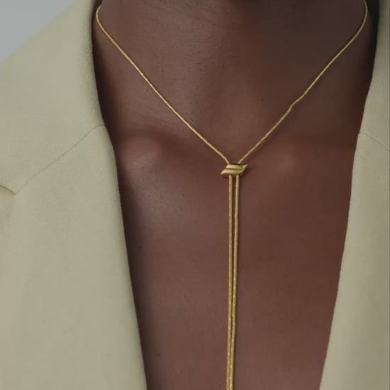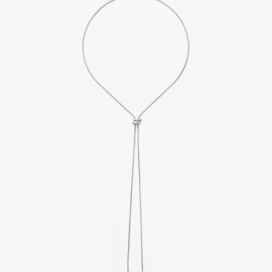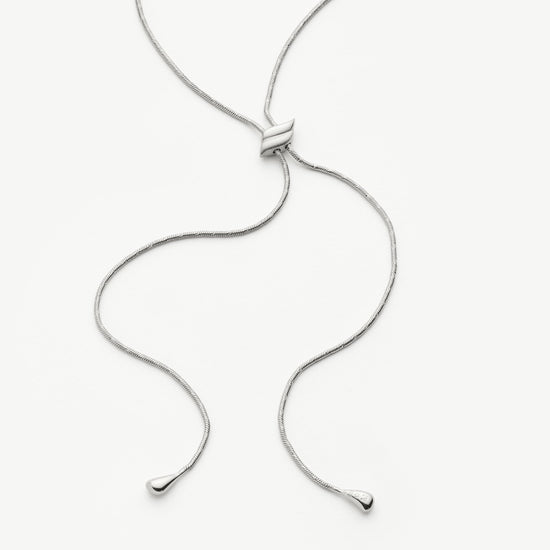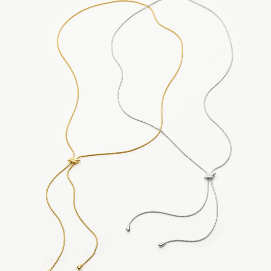 This statement lariat necklace features two droplet pendants with a matte and high shine finish, as well as a adjustable signature Savi 'S' slider for added versatility. Wear your way as a choker or as a medium necklace.