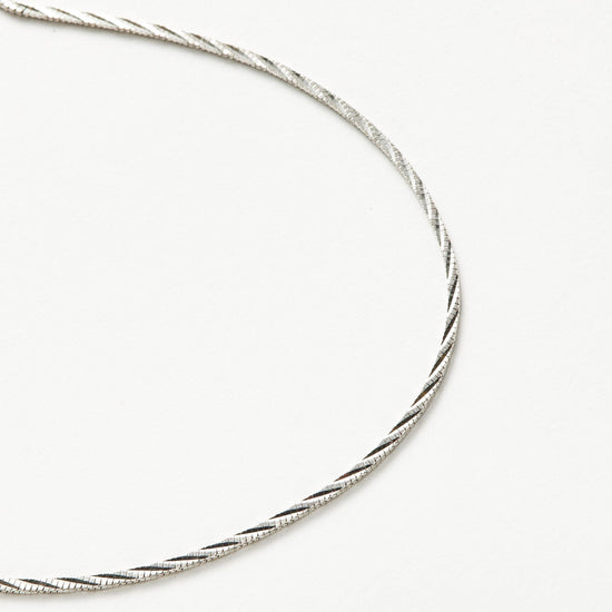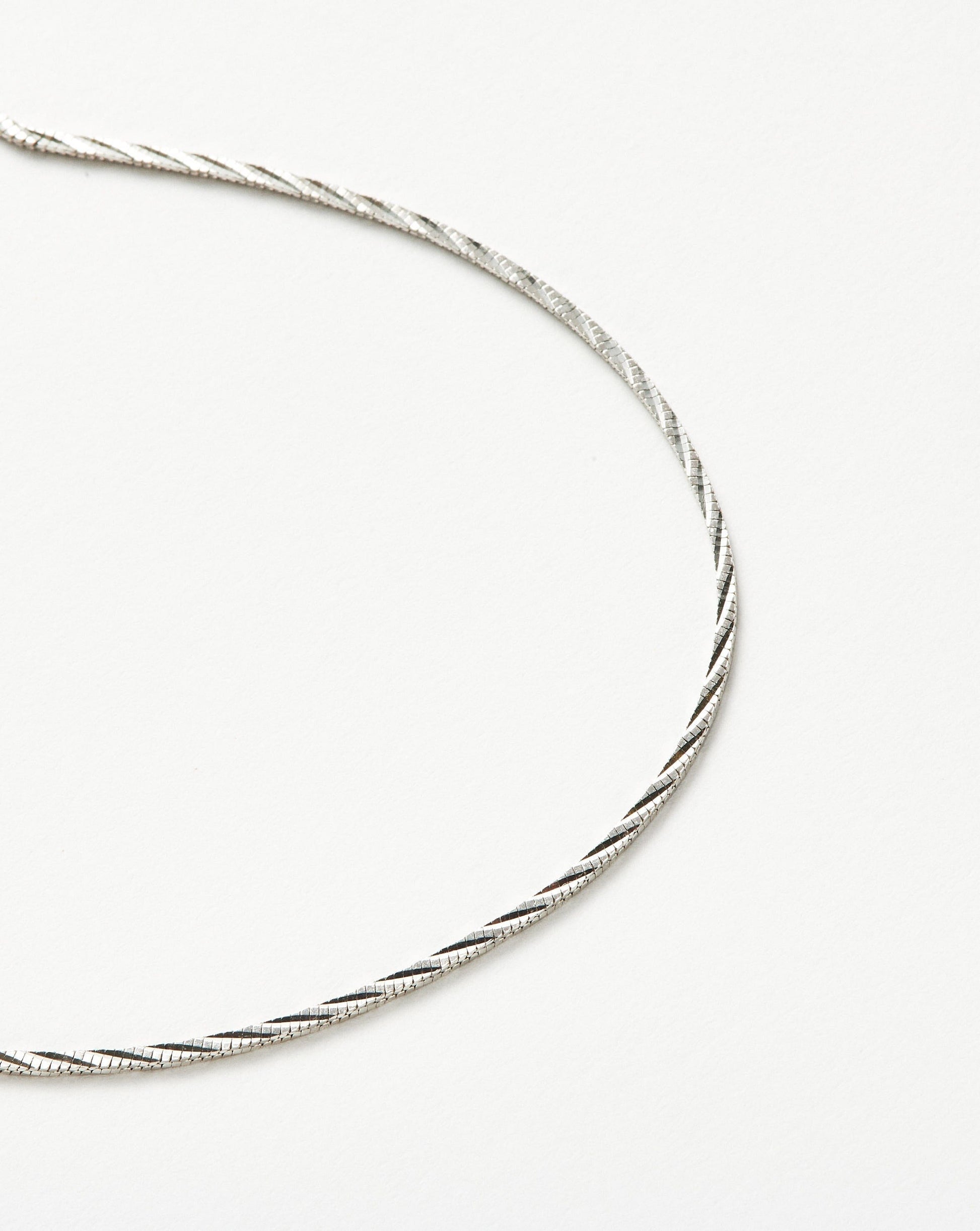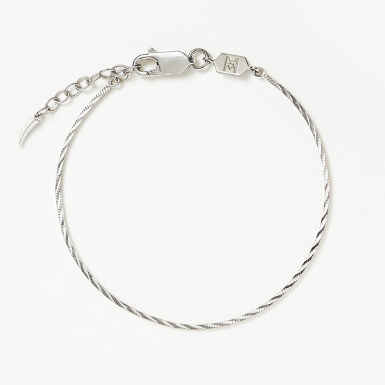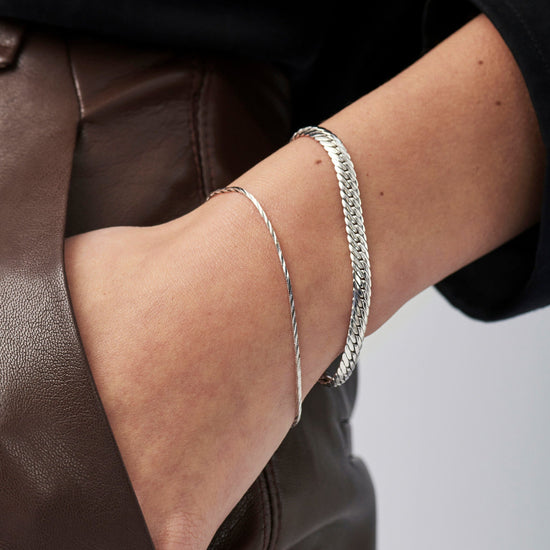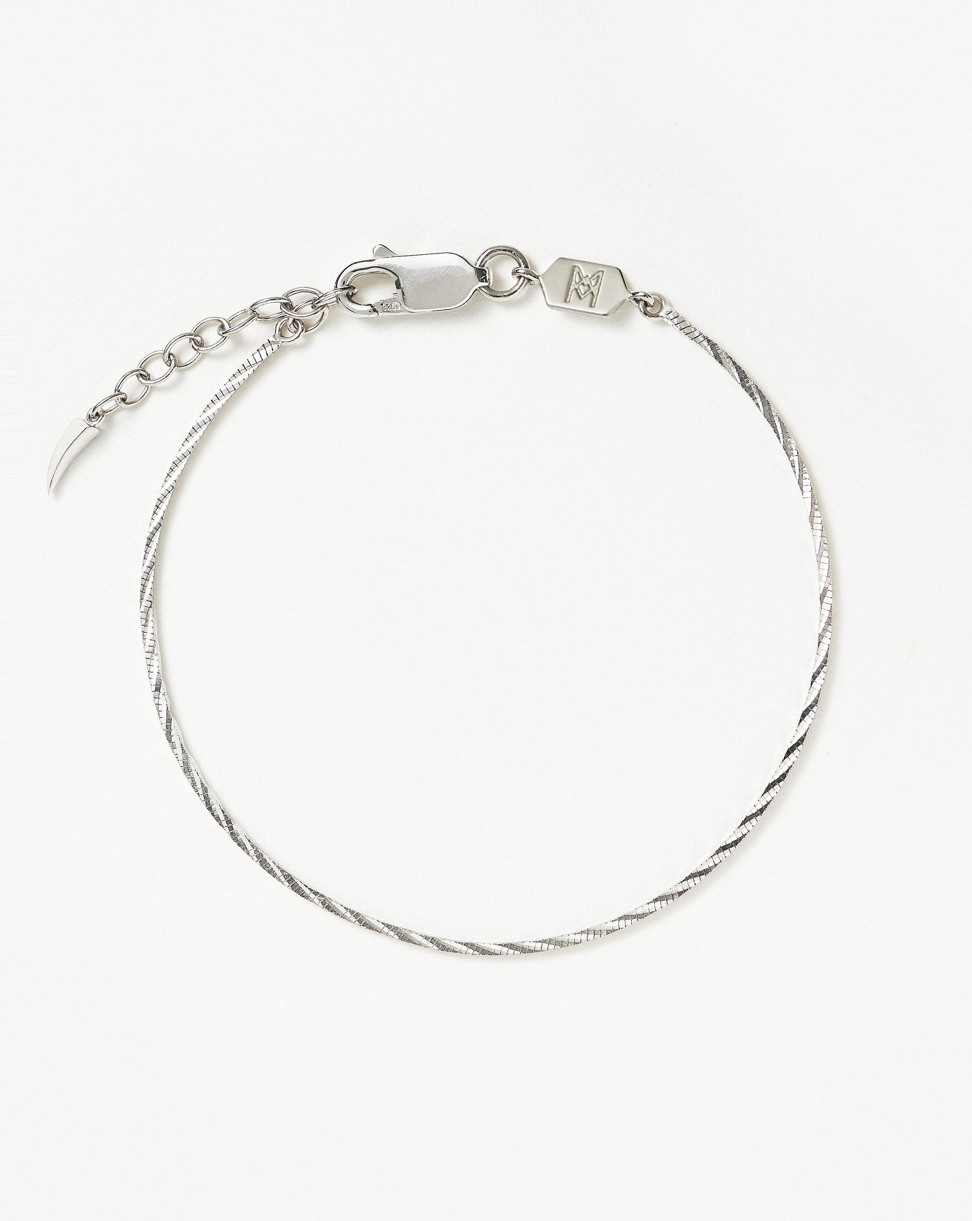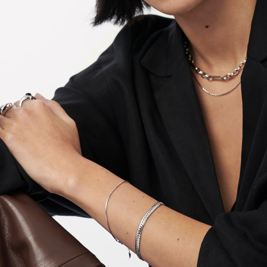 Pared-back modern meets vintage. Make this delicate square snake chain with diagonal engraved detail the starting point for all your layered looks. Pair with link or beaded chains to create a range of textures on the wrist.