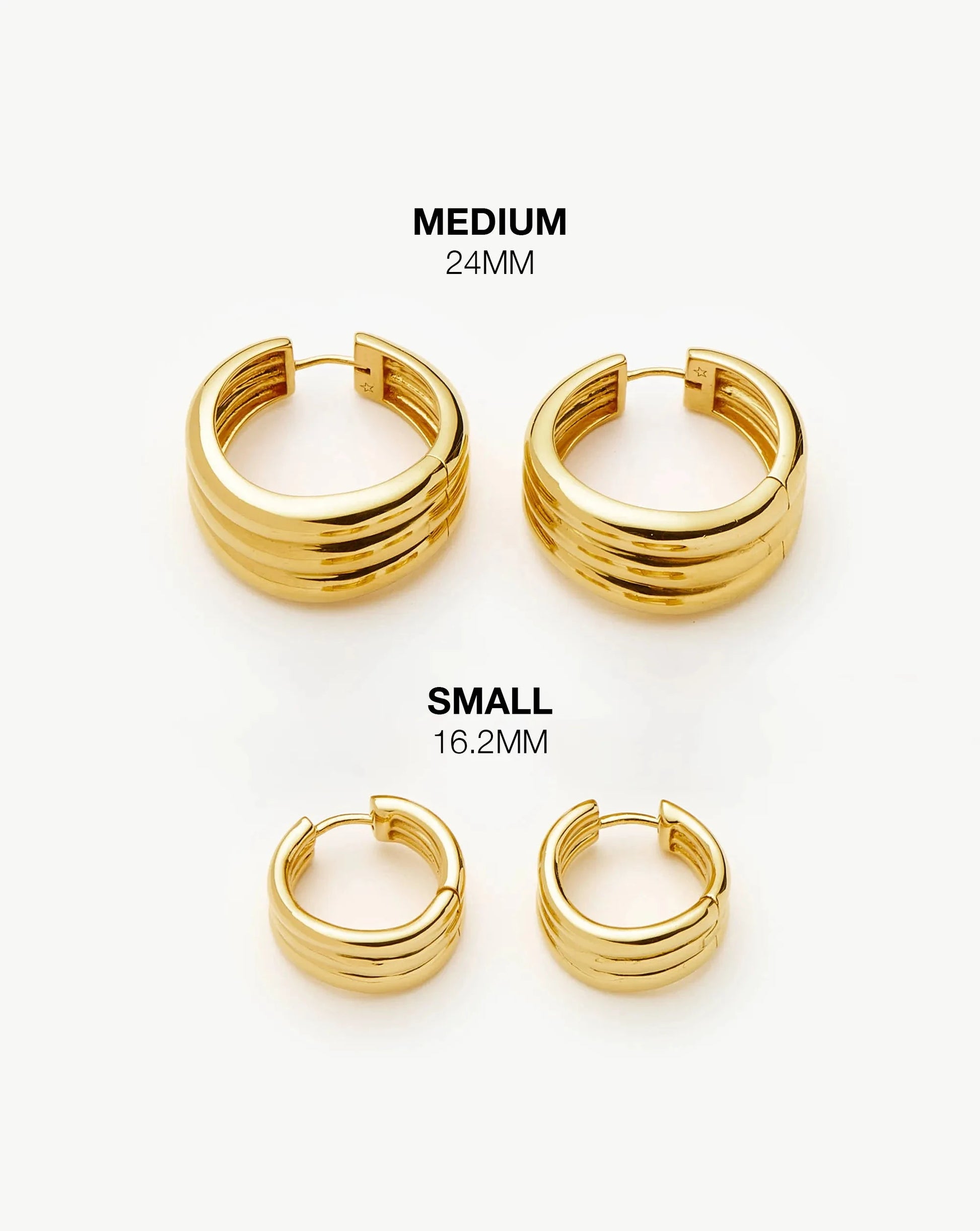 These organic small hoops feature triple ridge detailing with a high shine finish. Let them take centre stage or style with studs for an instant ear stack.