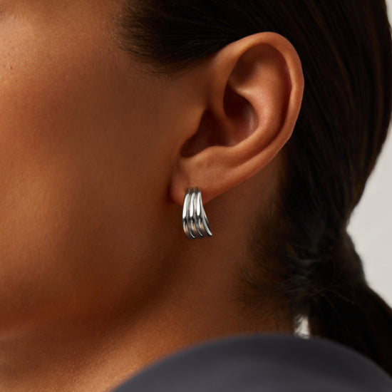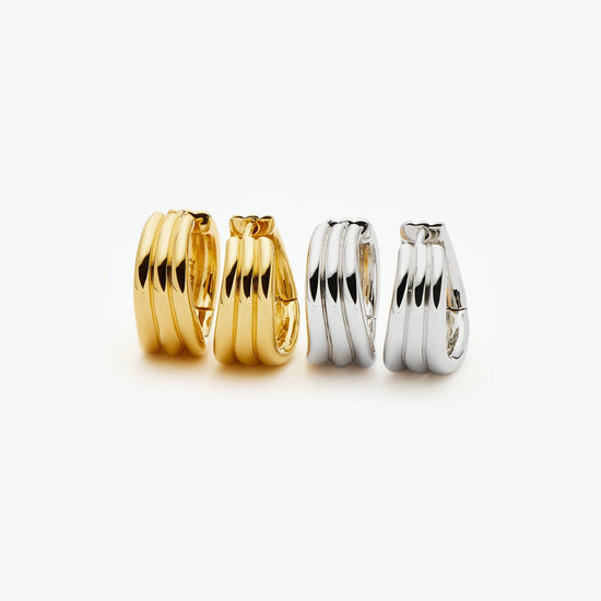 These organic small hoops feature triple ridge detailing with a high shine finish. Let them take centre stage or style with studs for an instant ear stack.