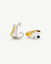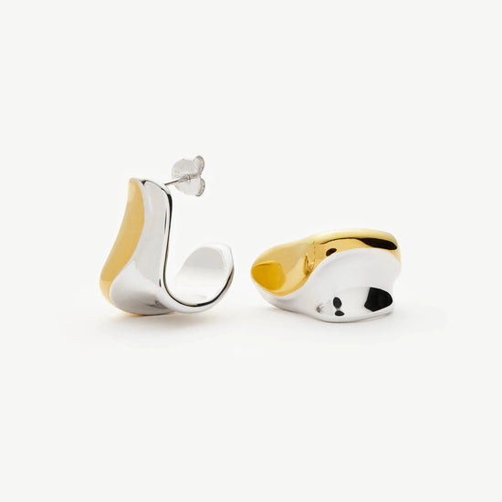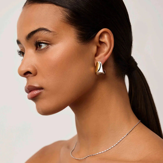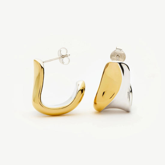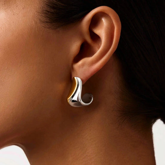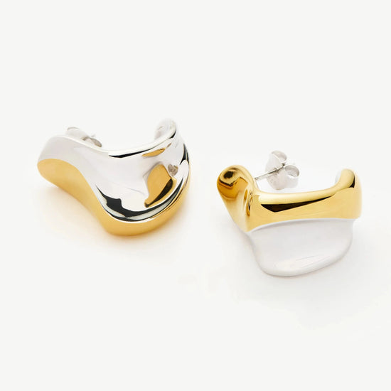 Inspired by sculptural shapes. These maximalist medium hoop earrings feature a unique crossover design with mixed metal gold and silver hoops. Style solo or pair with studs for an instant ear stack.