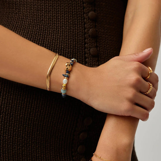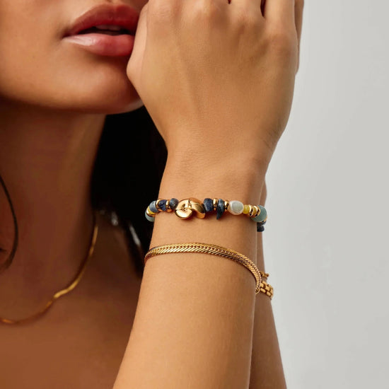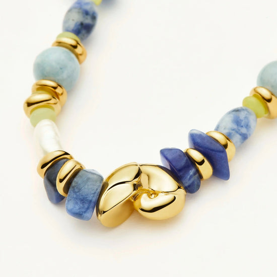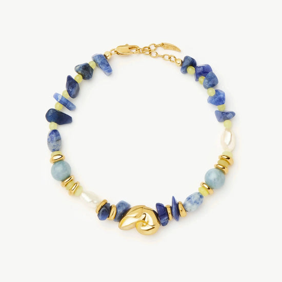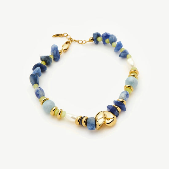 This coastal-inspired bracelet features a blend of multi-beaded gemstones and baroque pearls with a central gold shell bead. The perfect accessory for any summer occasion.