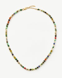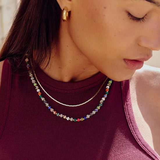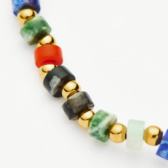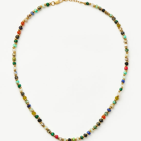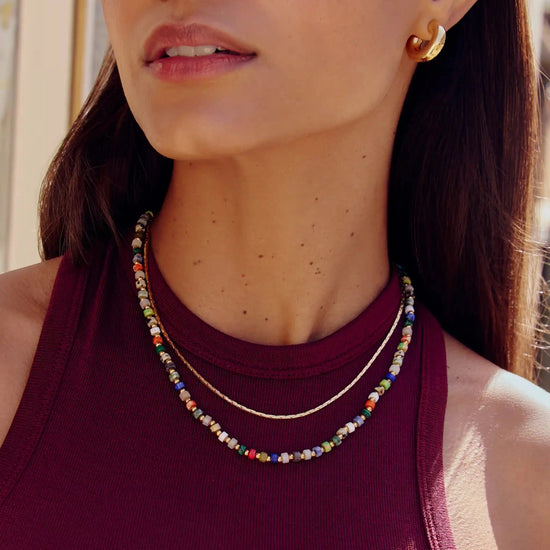 A kaleidoscope of color to express yourself with. This short necklace features a mix of reconstructed imperial jasper stones – known for tranquillity – and are contrasted and offset with small gold beads for a distinctive finish. Make a neckmess with this unique piece, or style it with one of our signature chunky chains or medium beaded necklace.