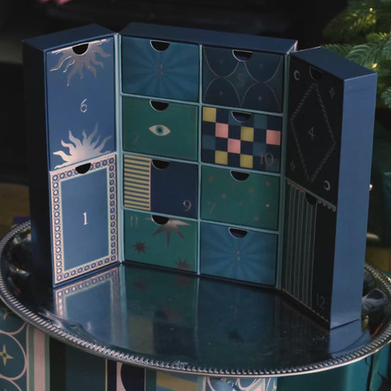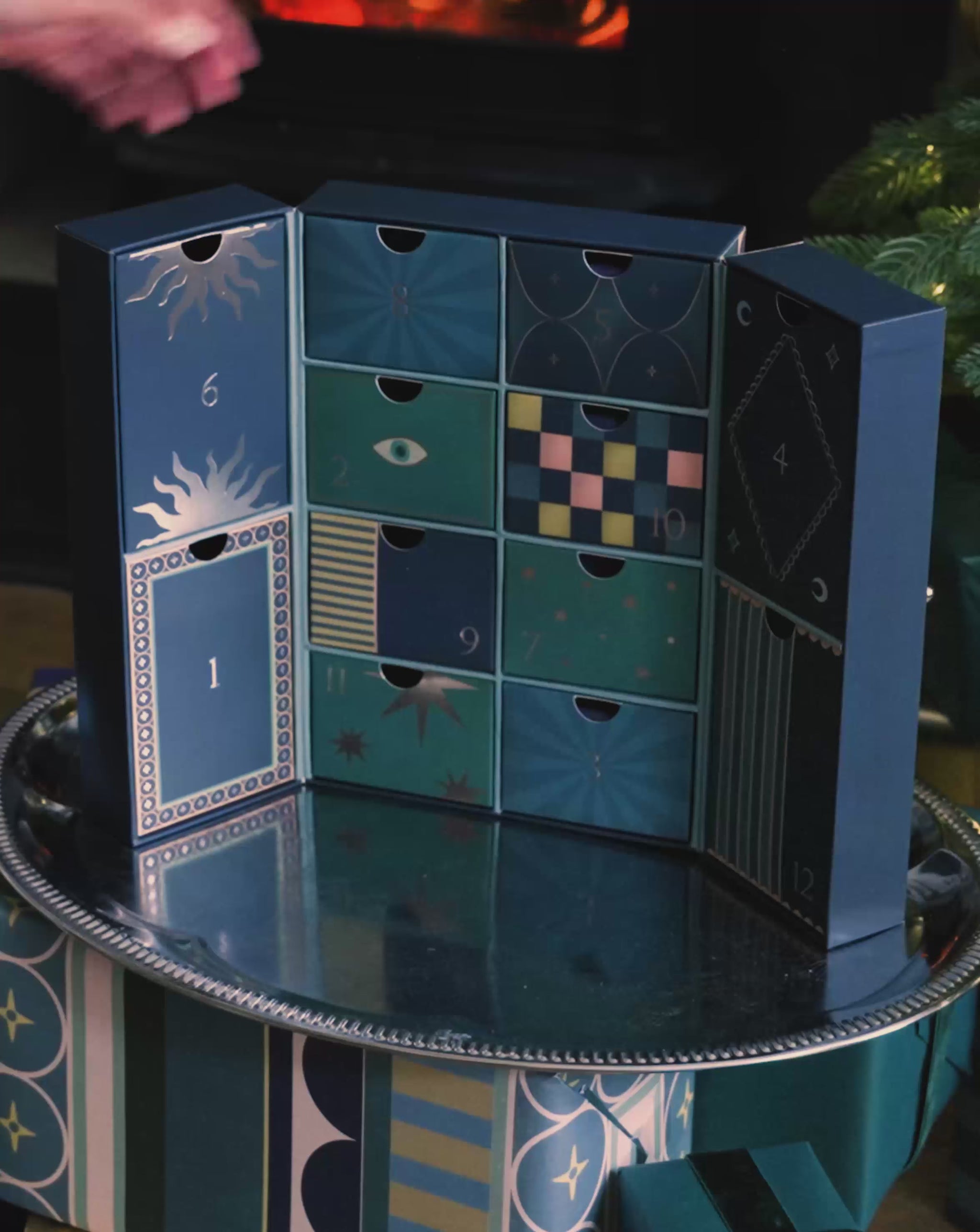 The keepsake jewelry box can be used all-year-round as a sustainable alternative and houses 12 gifts all wrapped up beautifully in celestial-inspired numbered boxes.