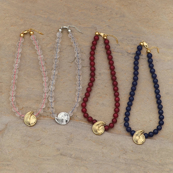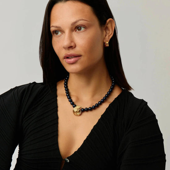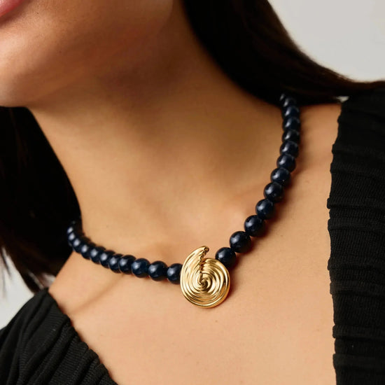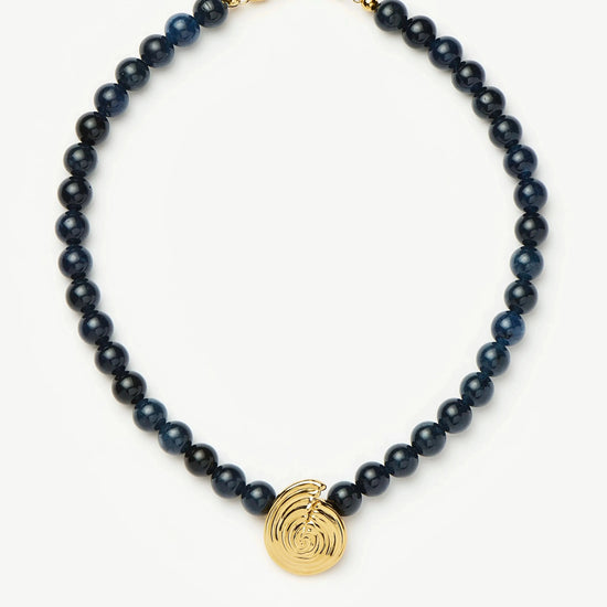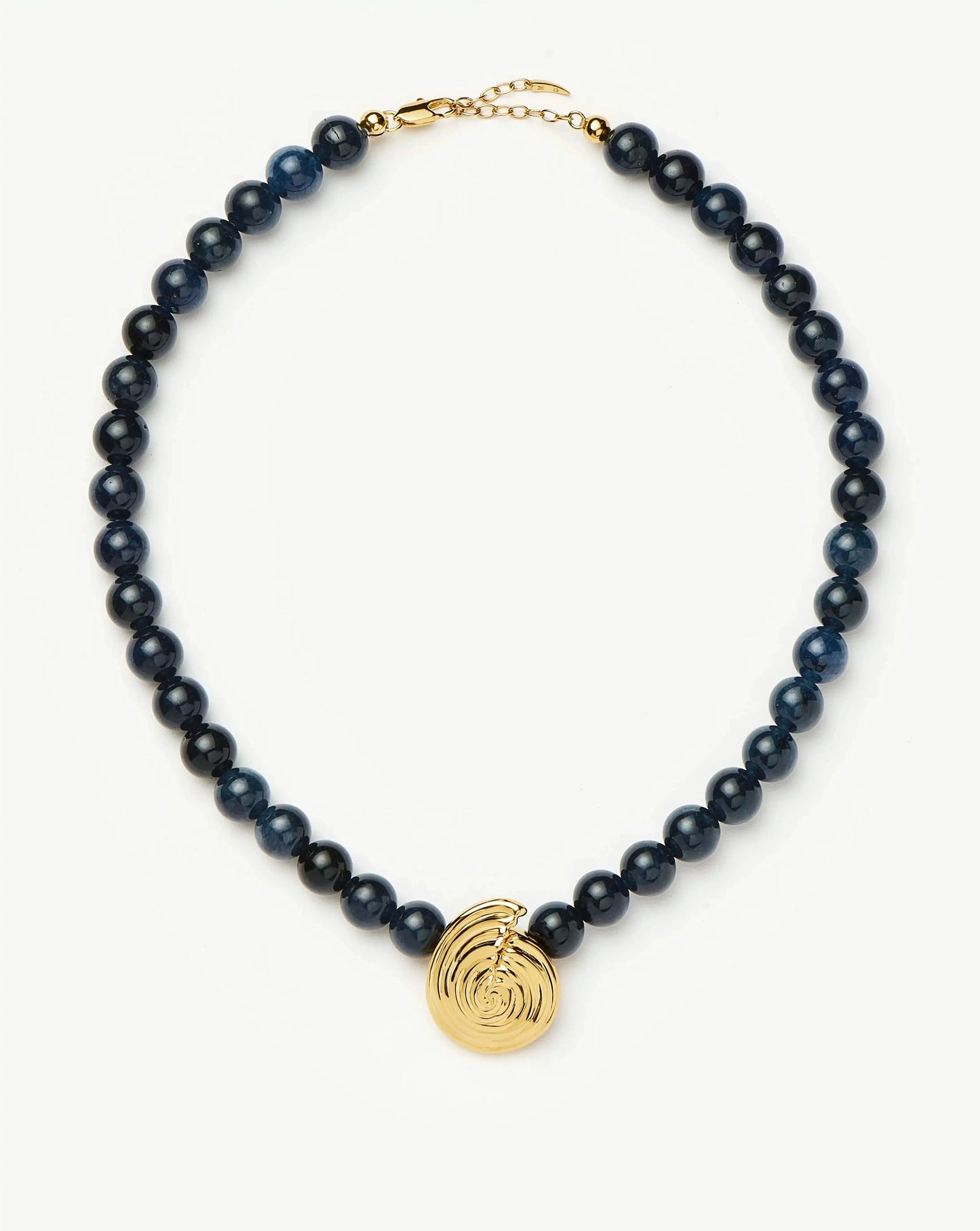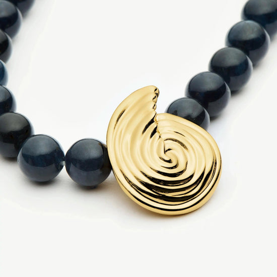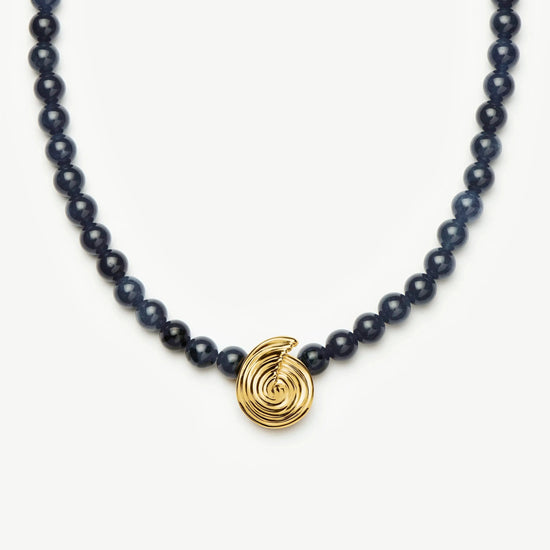 Inspired by elevated coastal shapes, this dark blue crystal quartz beaded necklace features a central gold spiral pendant. The rounded beads are naturally unique. Layer with delicate gold chain necklaces to create contrast or style with oversized studs to complete the perfect summer set.
