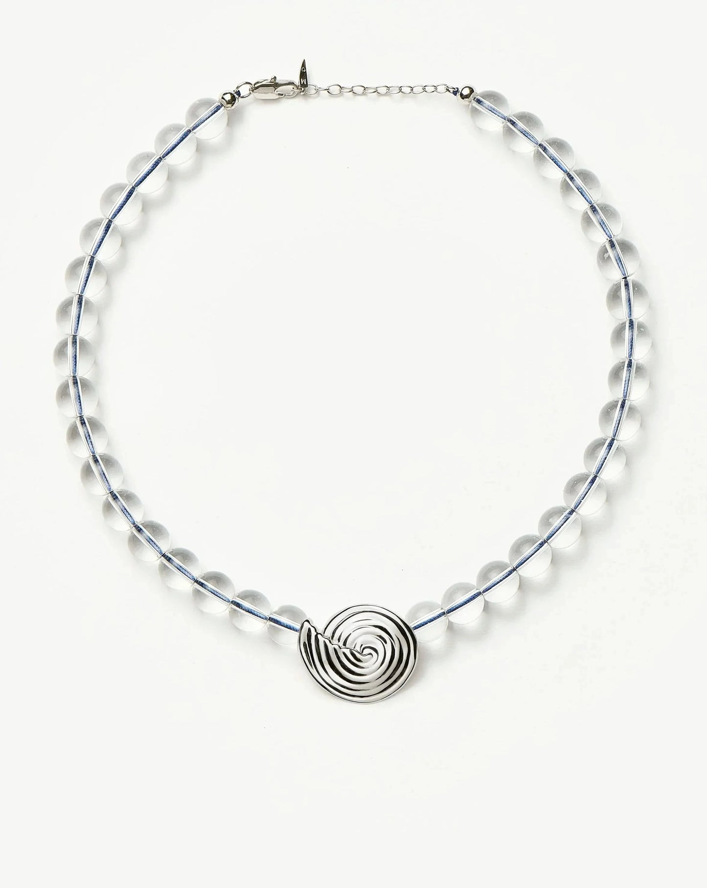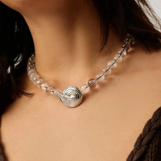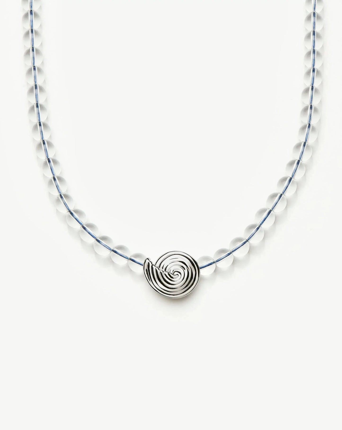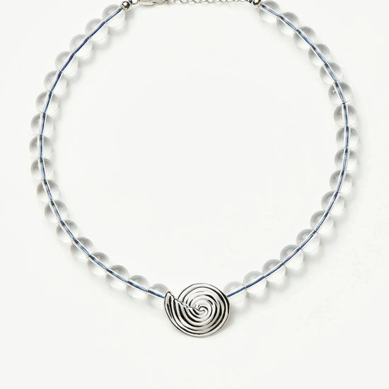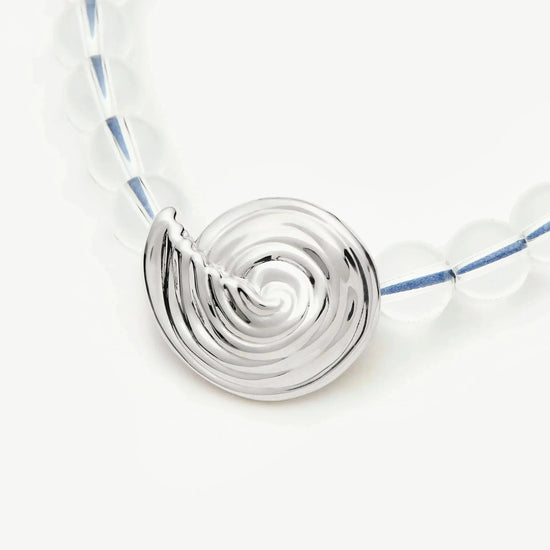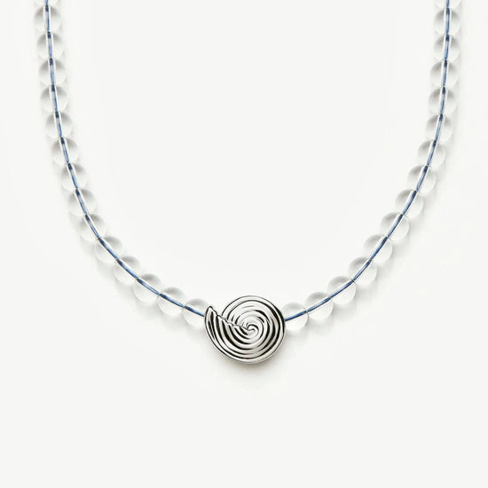 Inspired by elevated coastal shapes, this clear crystal quartz beaded necklace features a central silver spiral pendant and a blue-coloured thread. Layer with delicate silver chain necklaces to create contrast or style with oversized studs to complete the perfect summer set.