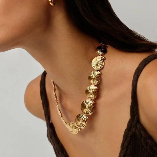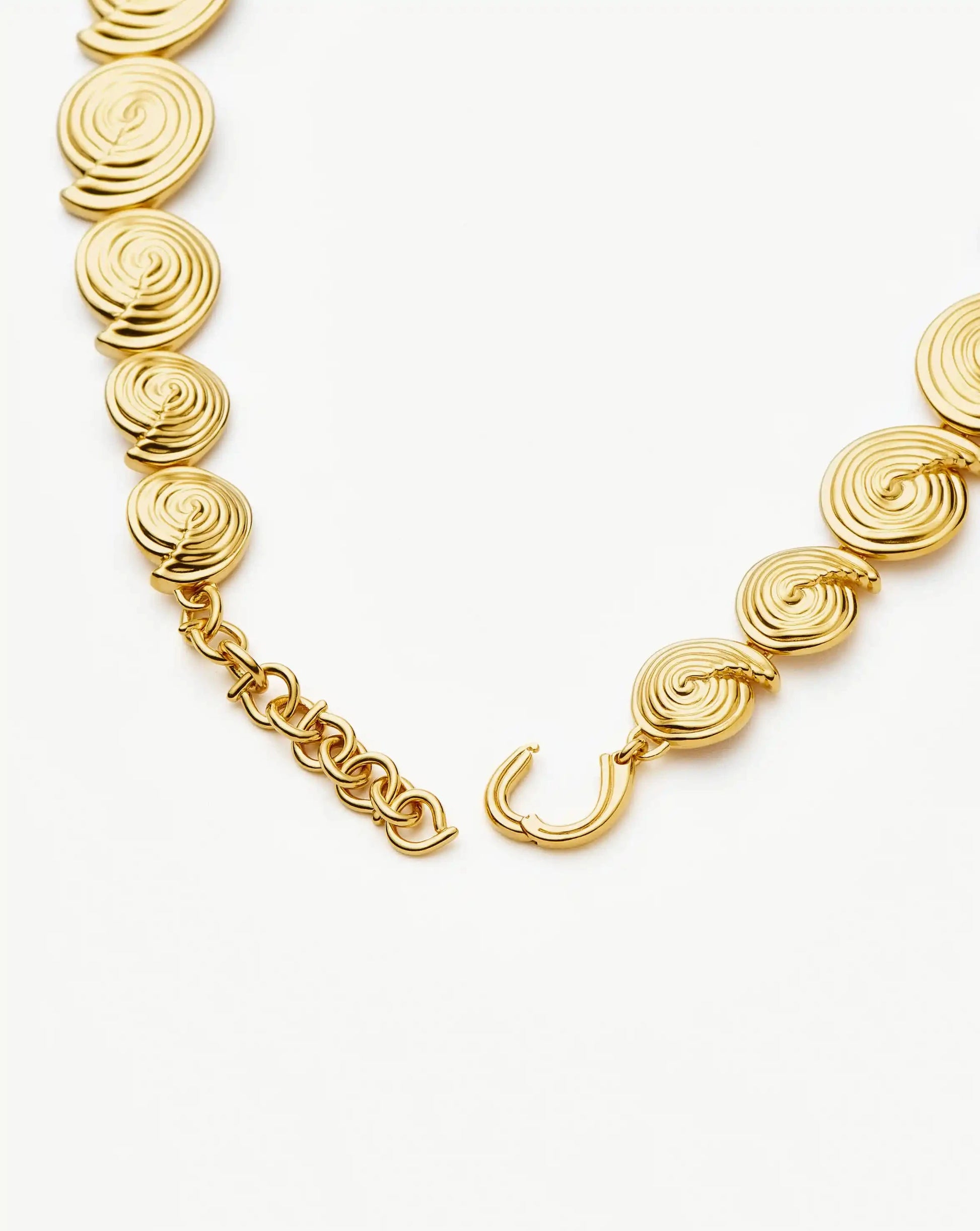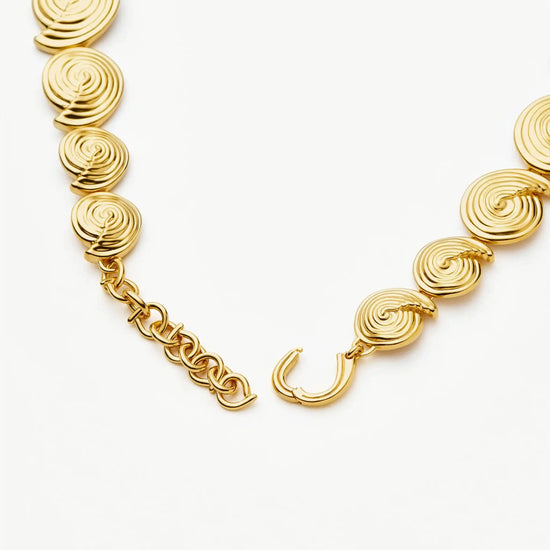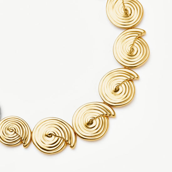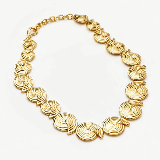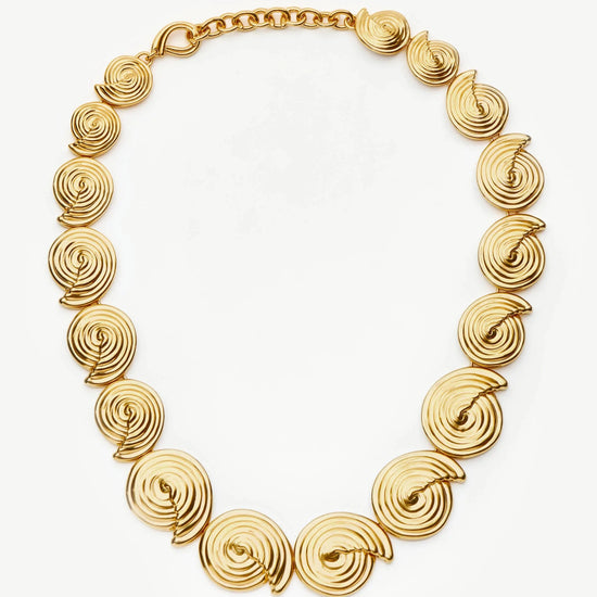 Introducing the statement necklace of the summer season. Iconic marine and natural elements are reimagined with this eye-catching necklace, featuring linked gold spiral elements and a bespoke chain extension. Wear on it's own or team with best selling gold earrings.