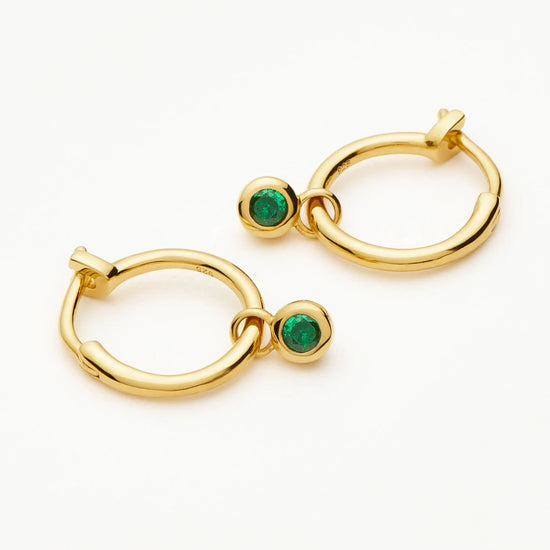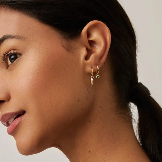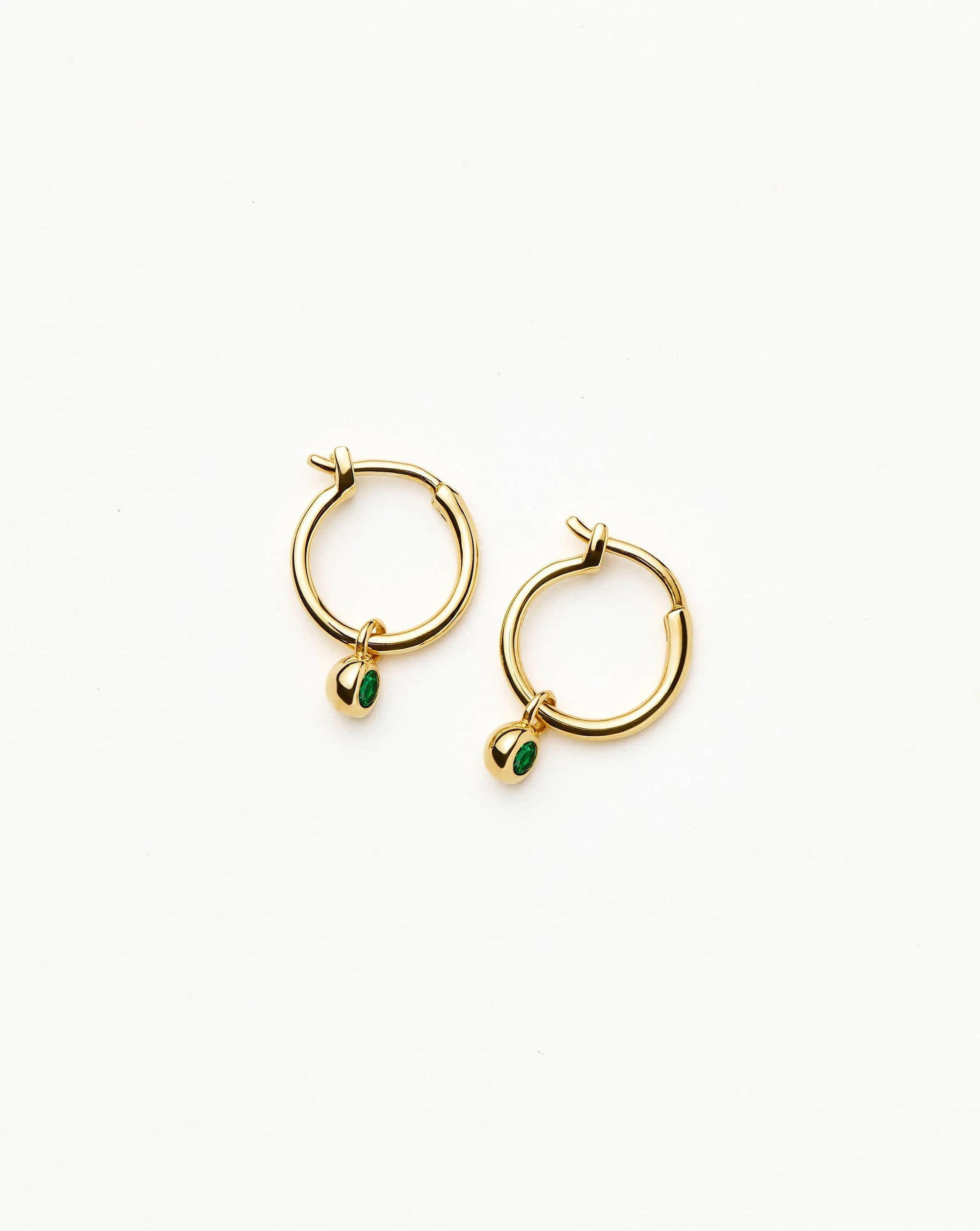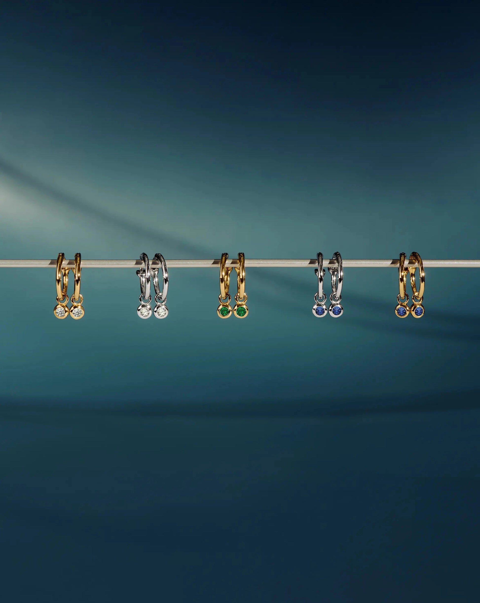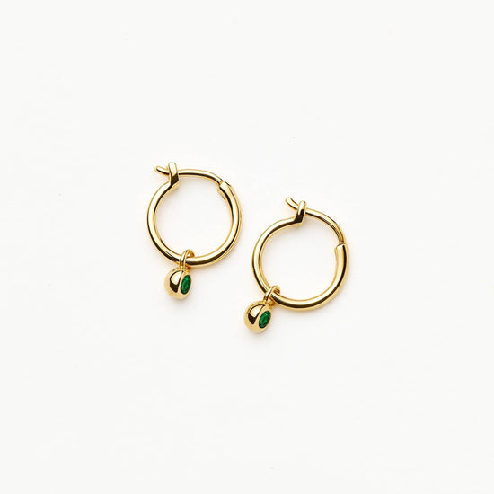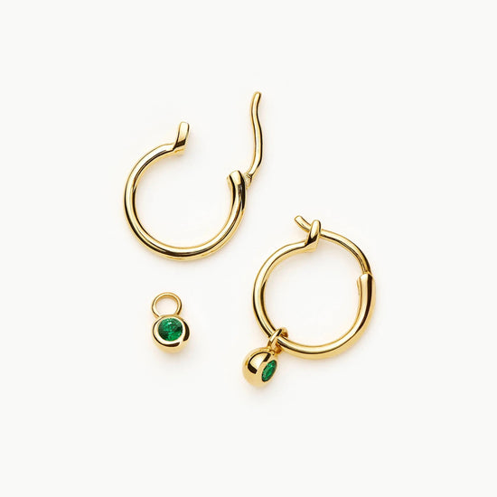 A new addition to our best selling Tennis Collection. These mini hoop earrings feature a emerald green drop charm embellished with faceted nano-crystals. A timeless design for everyday wear or perfect for May birthdays.