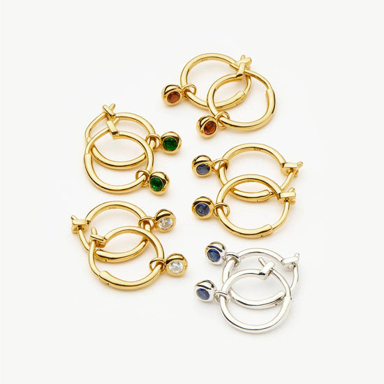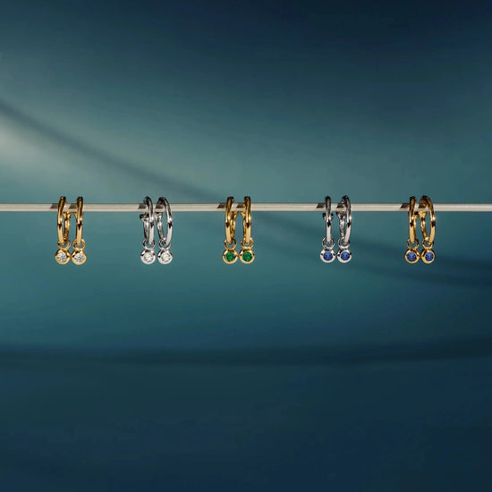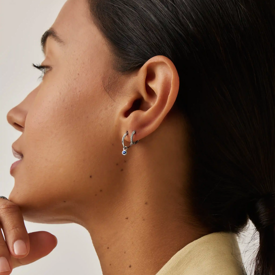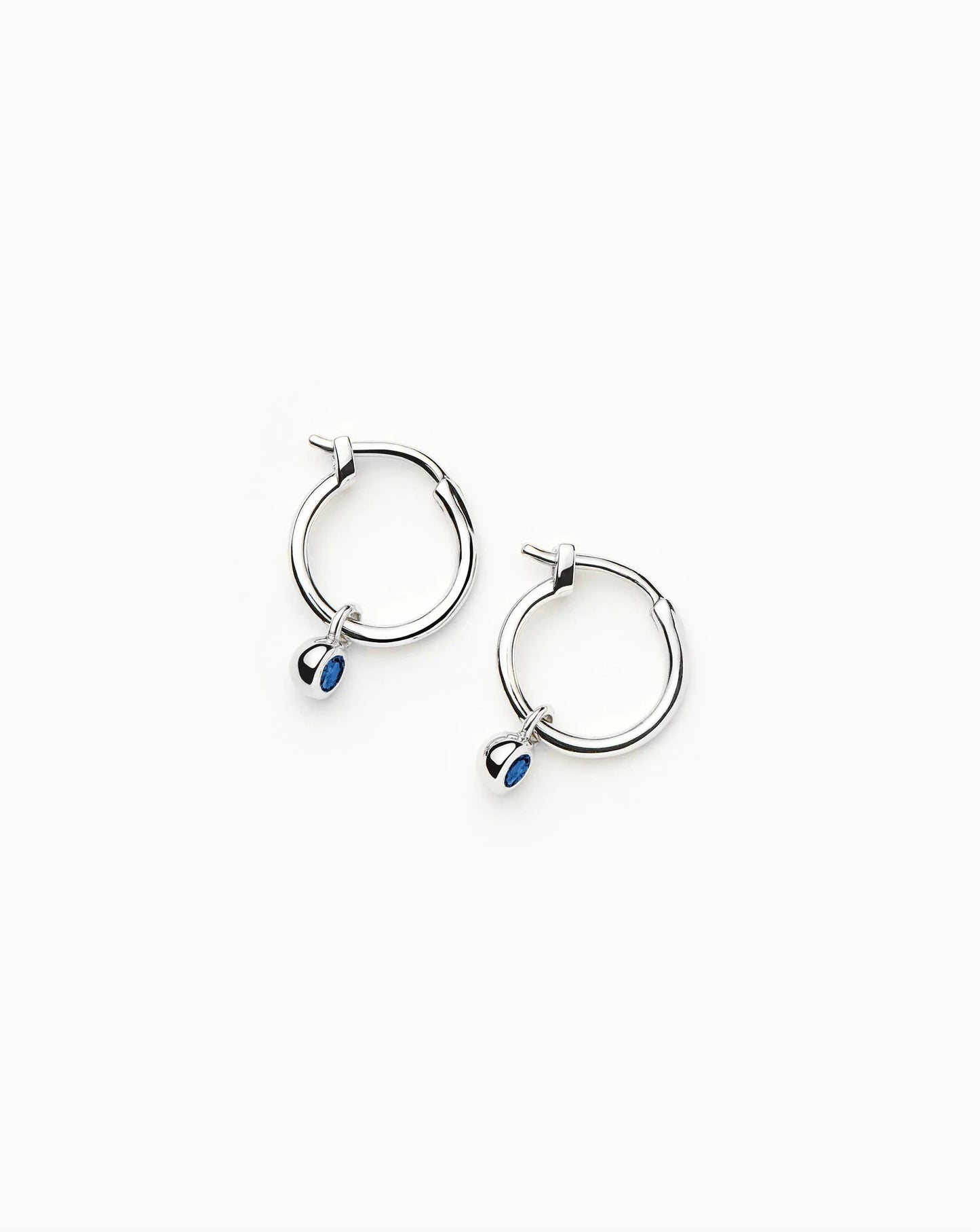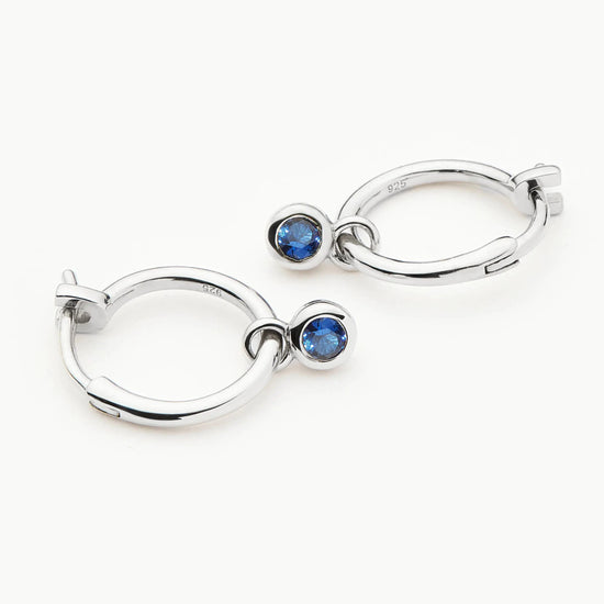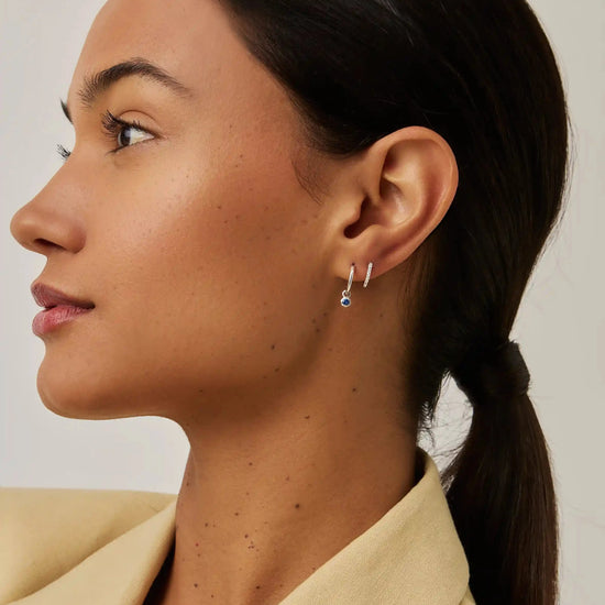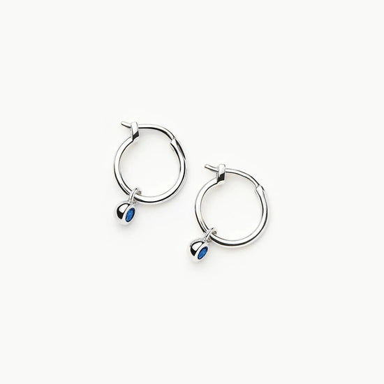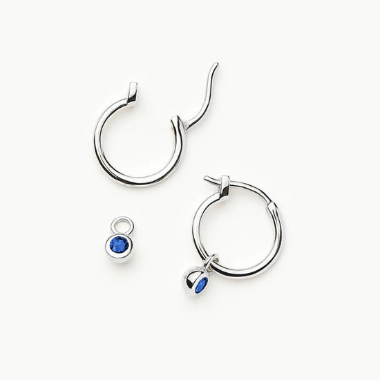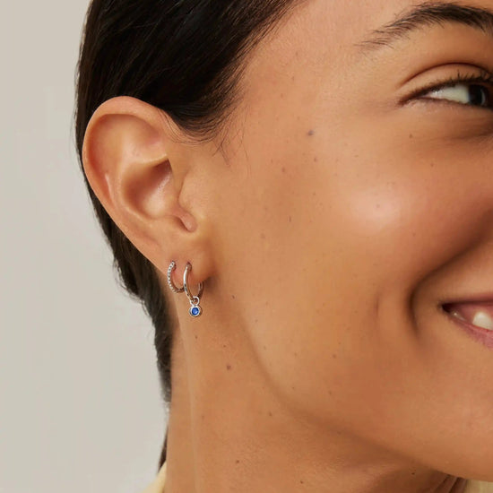 A new addition to our best selling Tennis Collection. These mini hoop earrings feature a sapphire blue drop charm embellished with faceted nano-crystals. A timeless design for everyday wear or perfect for September birthdays.