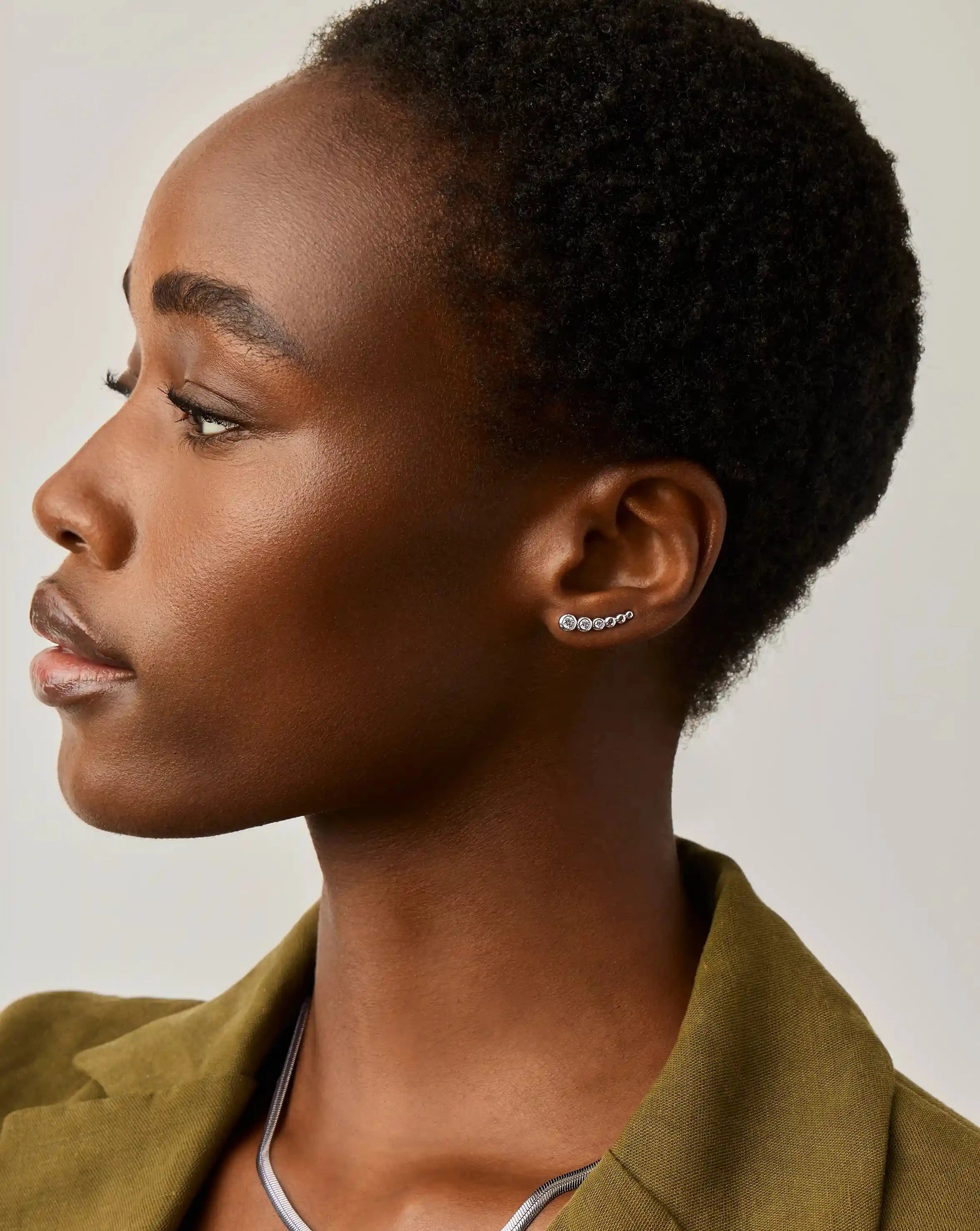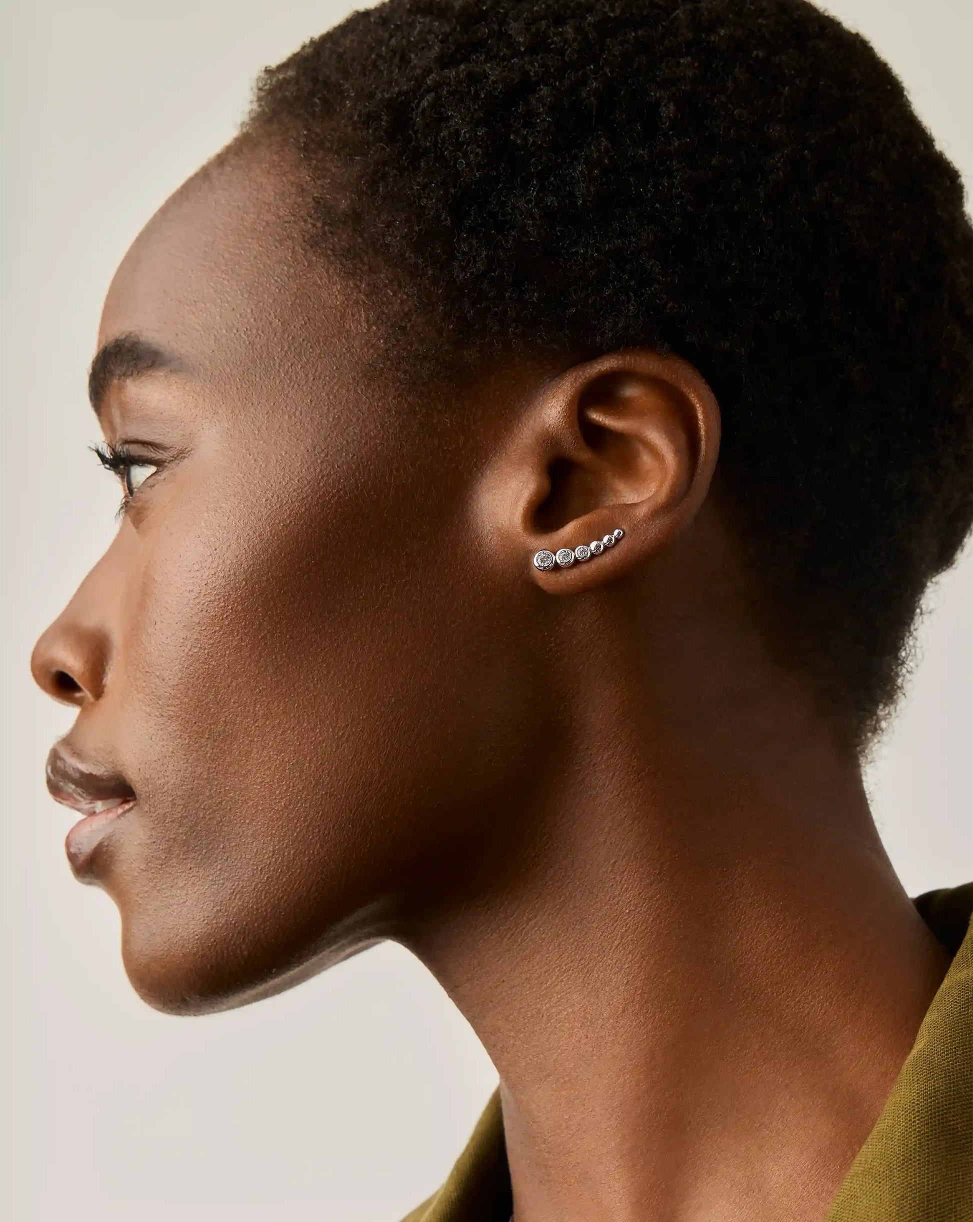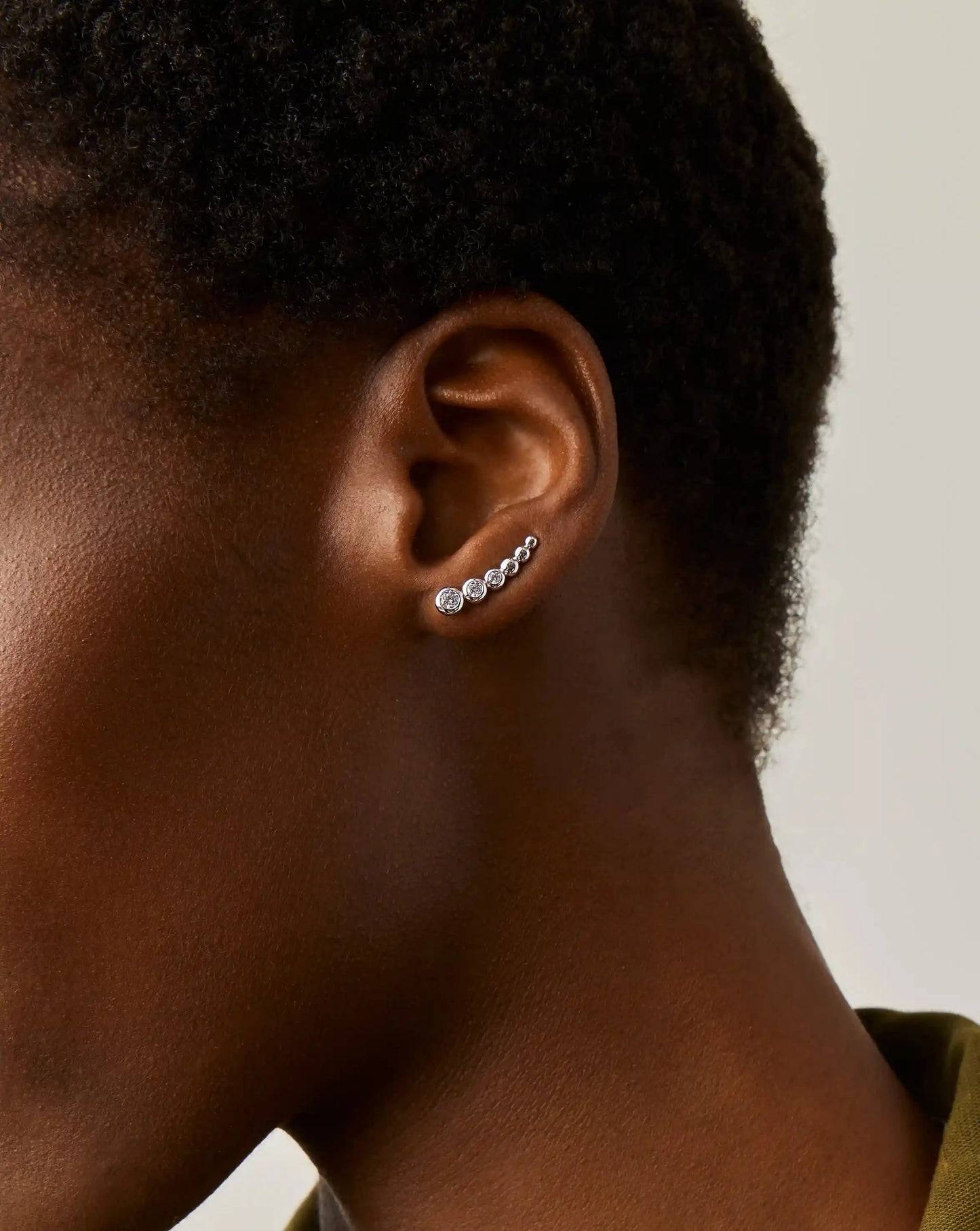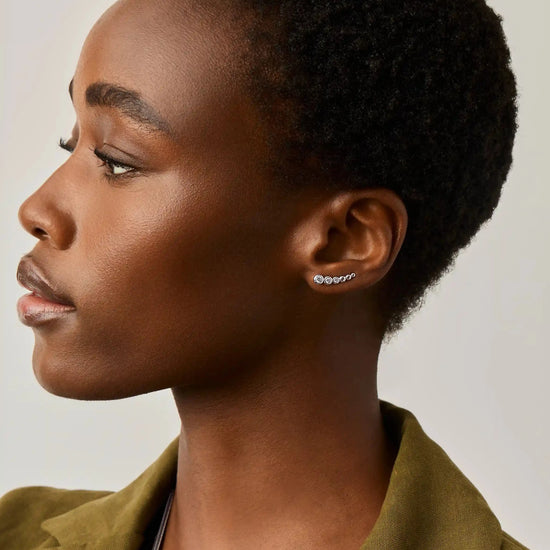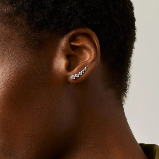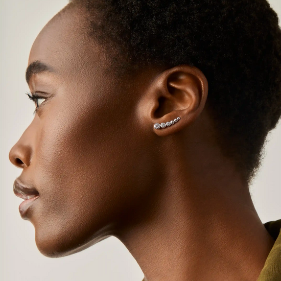 Slide the curved backing through your ear piercing and gently rotate the earring upward, following the natural line of your earlobe. Gently squeeze the earring to rest securely in place.