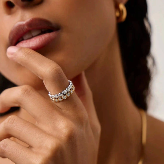 This classic gold eternity ring features beaded detailing, embellished with cubic zirconia. Wear solo or team with more rings for an instant stack.