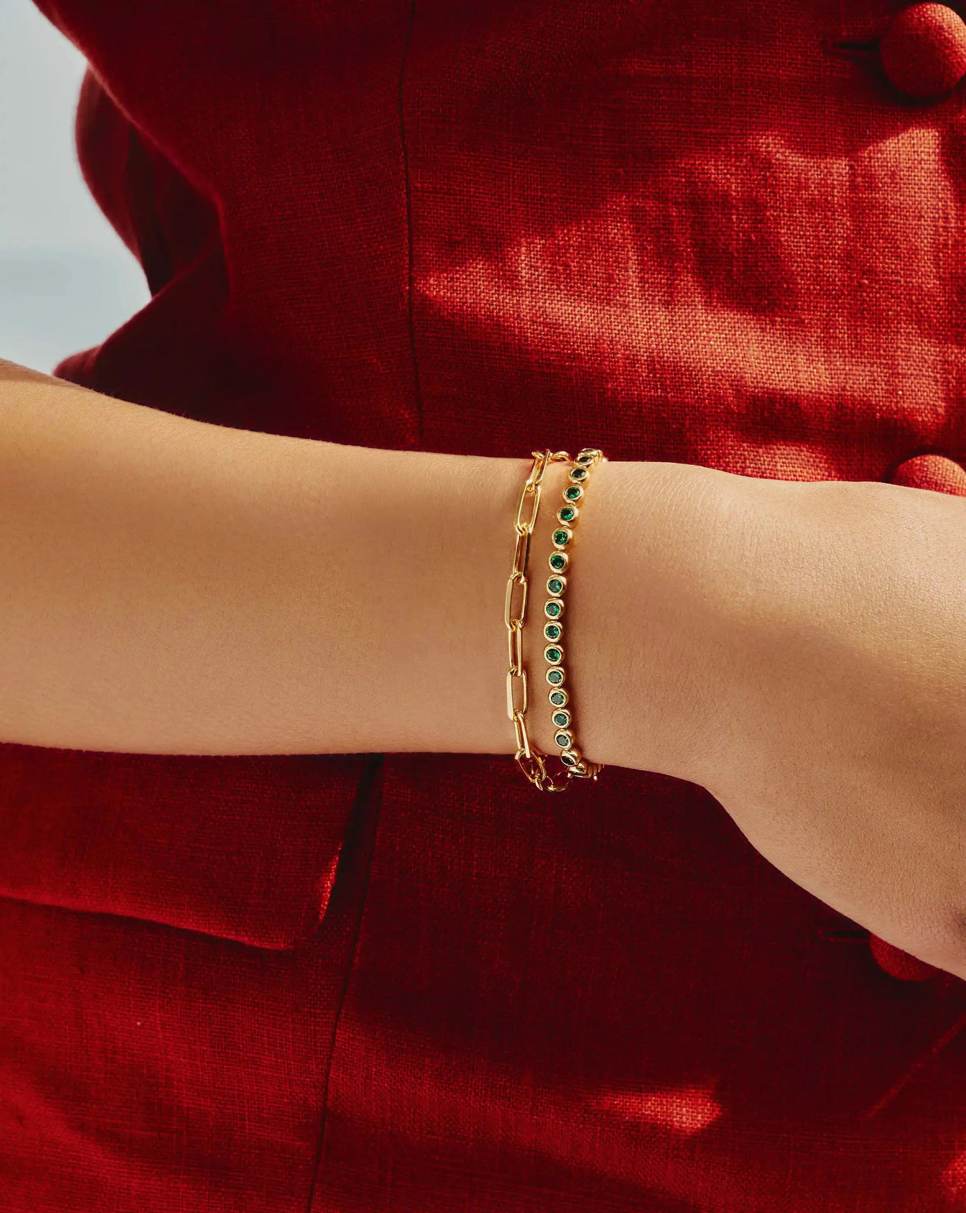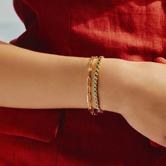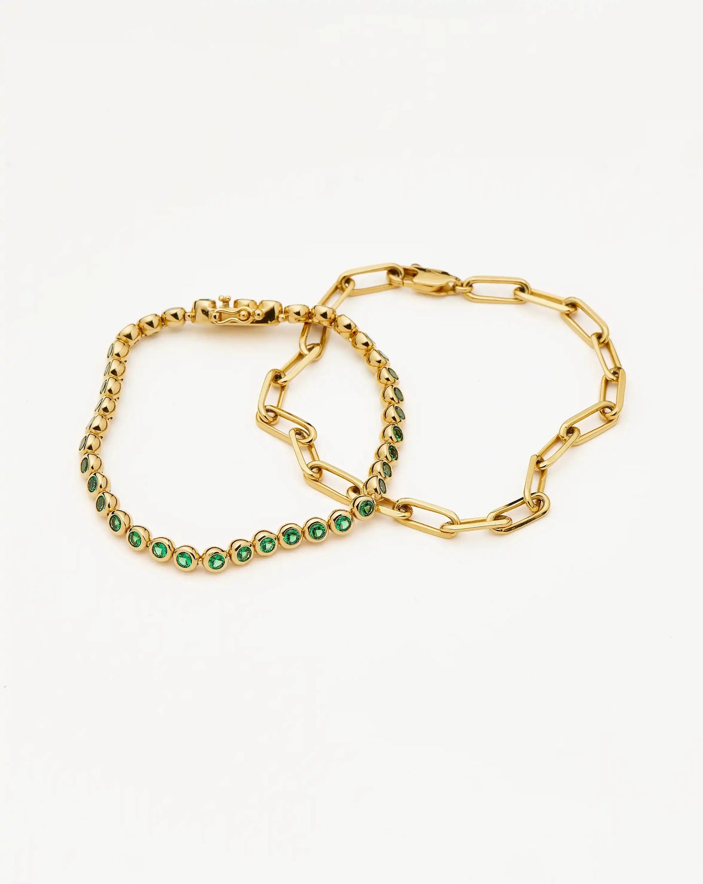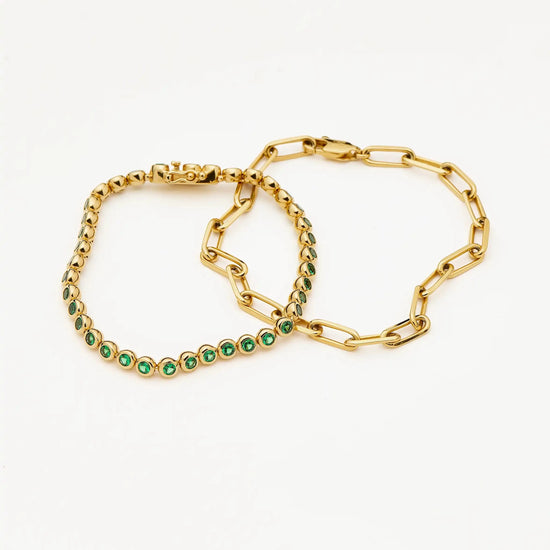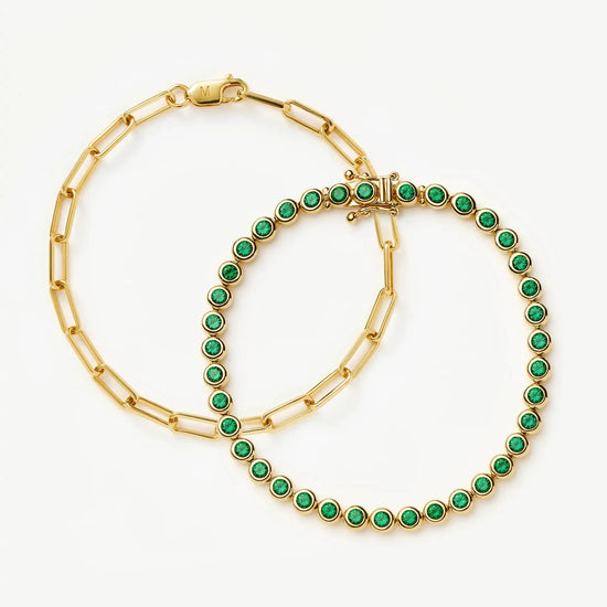 Our iconic Tennis Round Bracelet, now in a new emerald green colourway, teamed together with the classic Mini Paperclip Chain Bracelet.