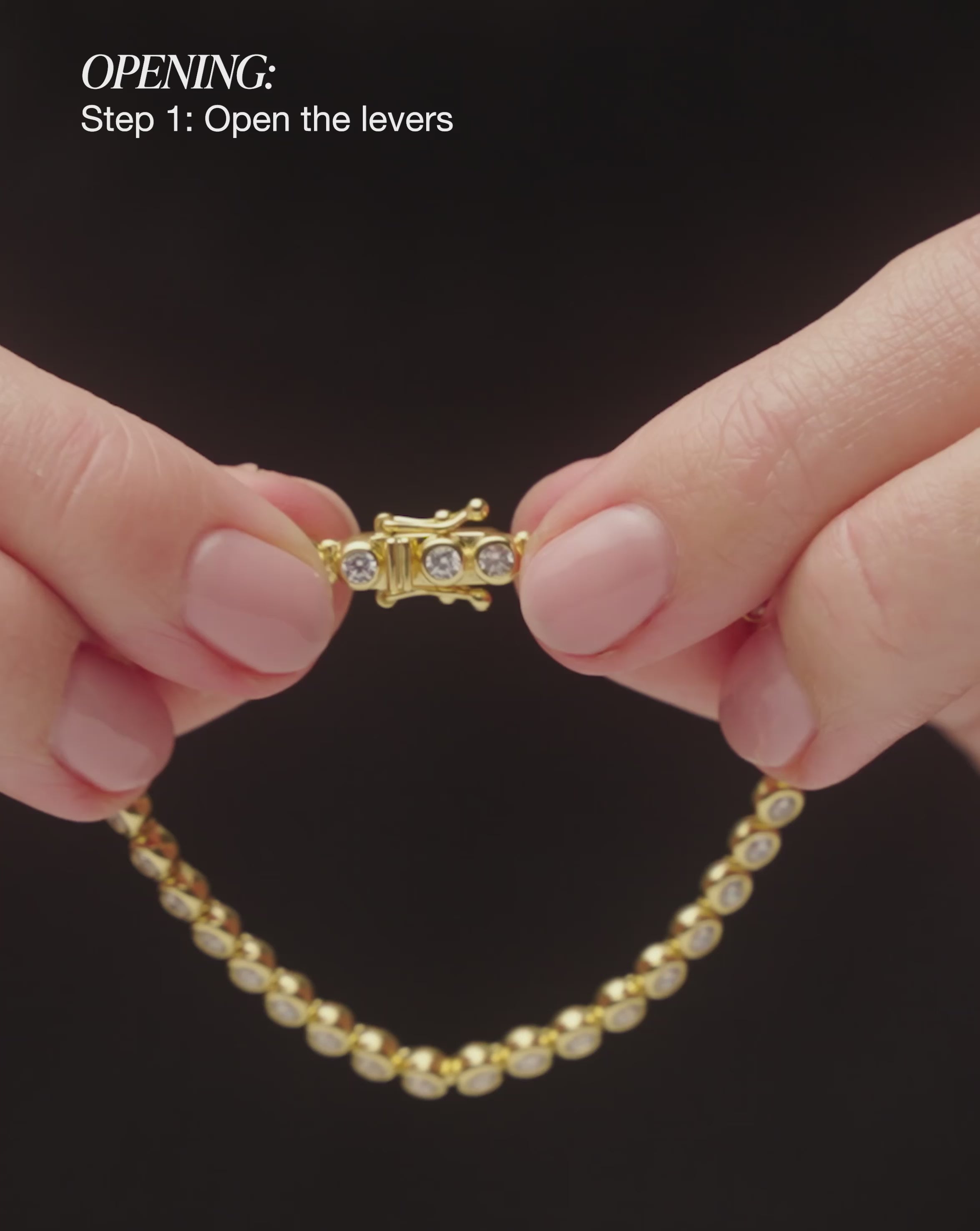Secure your bracelet by inserting the tongue into the clasp until there's a 'click' sound, then clip the arms down on both sides of the clasp. In order to take off your bracelet, unclip the arms and pull away from the sides of the clasp. Release the tongue by pressing the button.