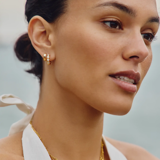 These classic small gold hoops feature beaded detailing, embellished with cubic zirconia. Wear solo or team with studs or a hoops for an instant ear stack.
