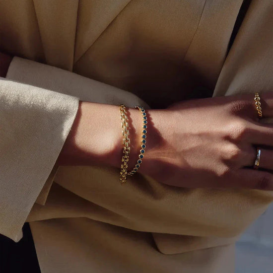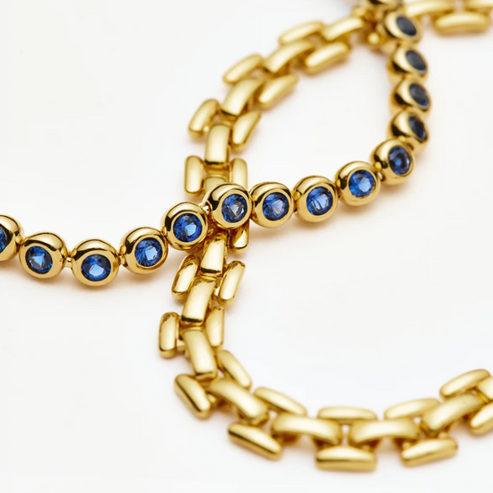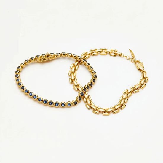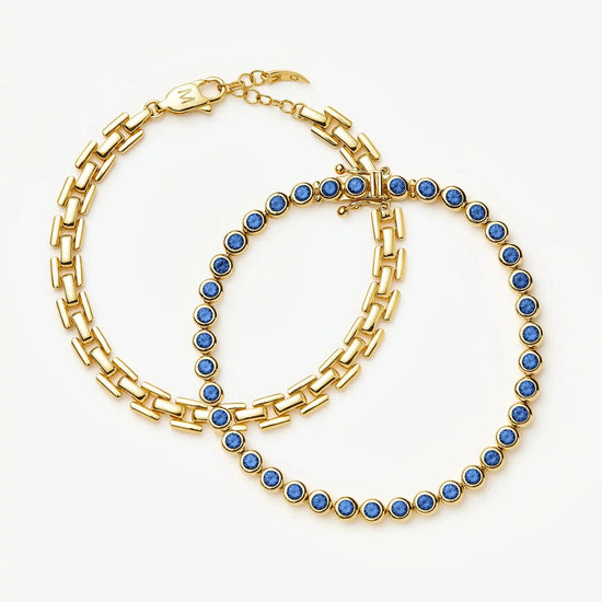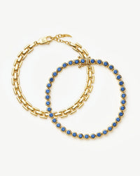 Two icons teamed together. Our Tennis Round Bracelet now in a new sapphire blue colourway, paired with the classic Timepiece Chain Bracelet. Wear together for double the impact.