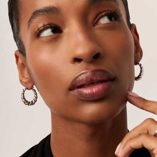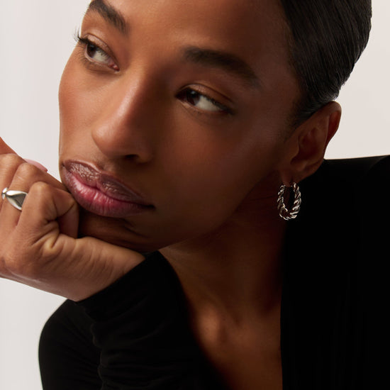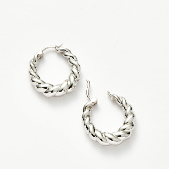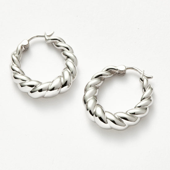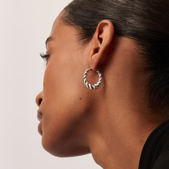 A medium-sized upgrade to our tidal mini hoops, these silver earrings feature a twisted tidal design inspired by rope detailing. Wear solo or style with studs and mini hoops for an instant statement ear stack.