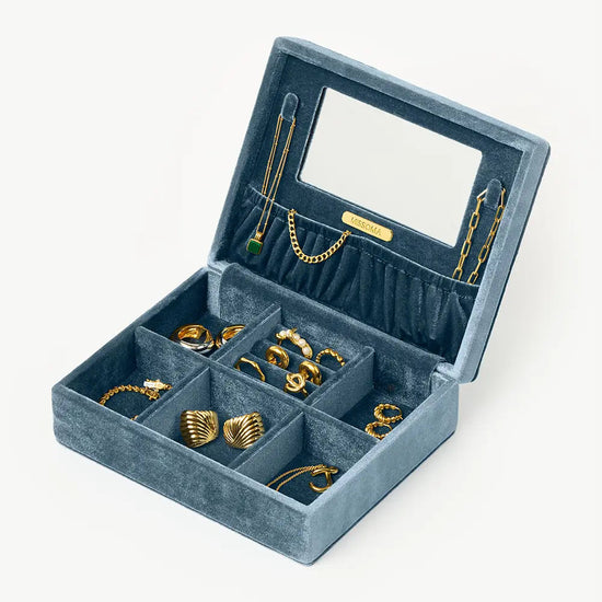 This luxe blue velvet jewelry box features six compartments with dedicated spaces for your necklaces and rings, a large mirror, plus bespoke embroidery inspired by the interiors of our London store. Keep your pieces shining in style.
