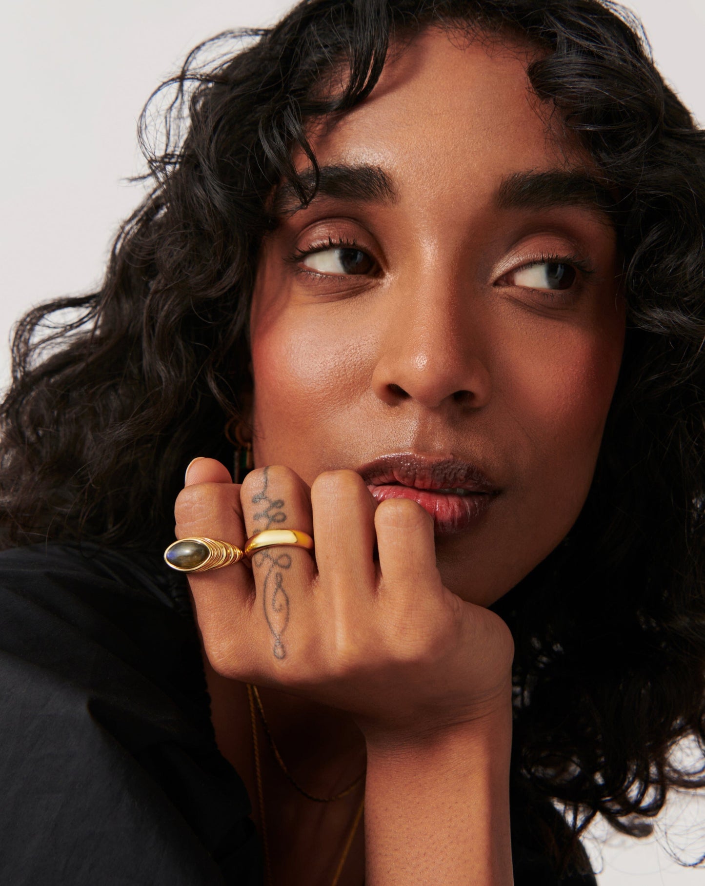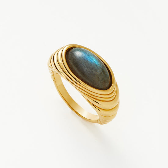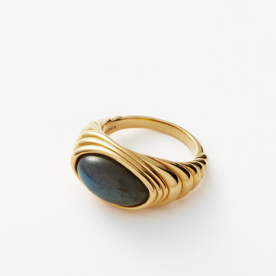 This gemstone statement ring features a labradorite stone that catches the lights with its open back setting. The twisted ridge detailing is inspired by the ripples of the ocean. Let it take centre stage in your ring stack.