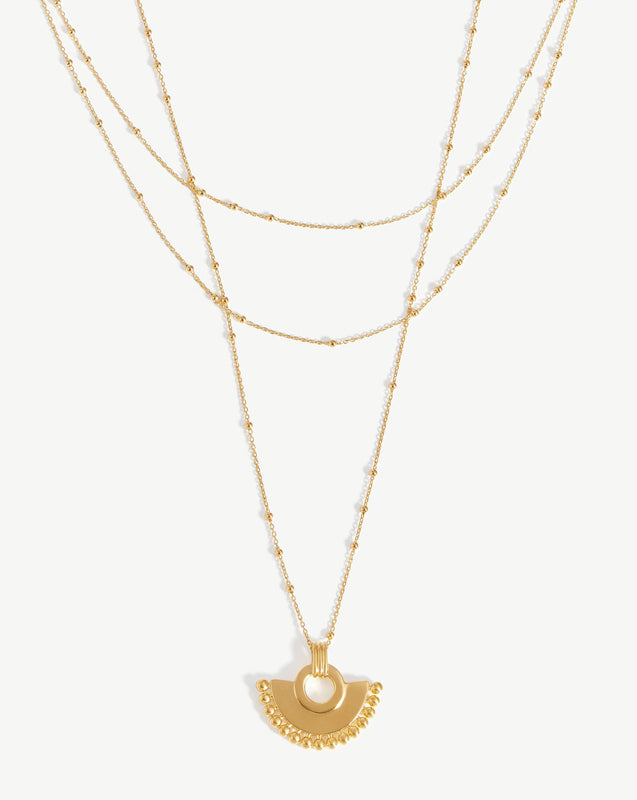 A distinctive addition to your layers. Inspired by Colombian artistry, this necklace features bobble-trimmed charms suspended from a unique fan-shaped pendant. A standout style you can easily wear day to night, create contrast by teaming with a gemstone choker.