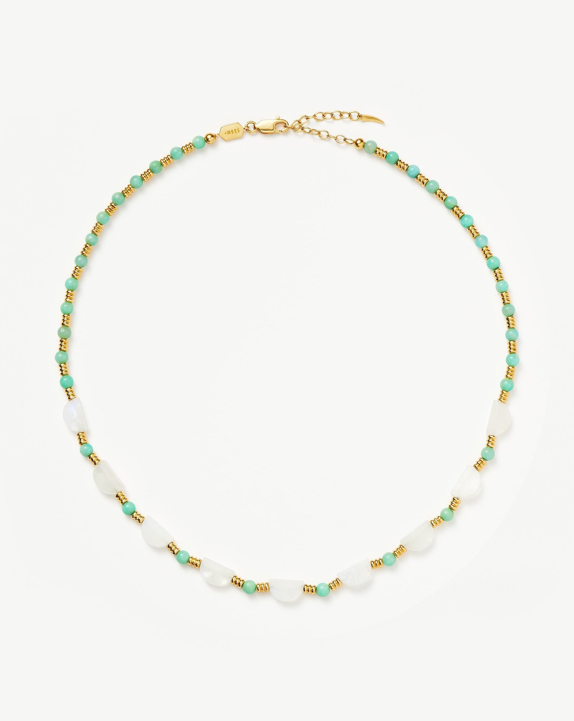 Inspired by our original best selling Zenyu collection. This everyday choker features hand-cut rainbow moonstone half moon shaped charms and round amazonite gemstone beads — known for new beginnings and healing — offset by ridged gold beads for a striking contrast. Layer with more beaded necklaces or pair with a Zenyu Gemstone Beaded Bracelet.